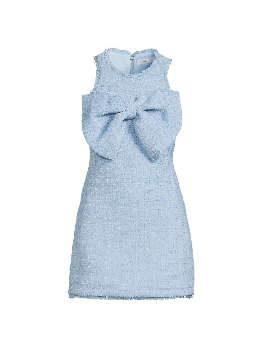 Crafted of textured tweed, Likelys Lucas minidress showcases an oversized tonal bow at the bust. This charming piece features a round neck and sleeveless silhouette. Round neck Sleeveless Bow bust Concealed back zip closure 90% polyester/10% wool Dry clean Imported SIZE & FIT About 33 from shoulder to hem Model measurements: 510 tall Model is wearing a US size 4. Dress Collections - Contemporary Evening > Likely > Saks Fifth Avenue > Barneys. Likely. Color: Bluebell. Size: 12.