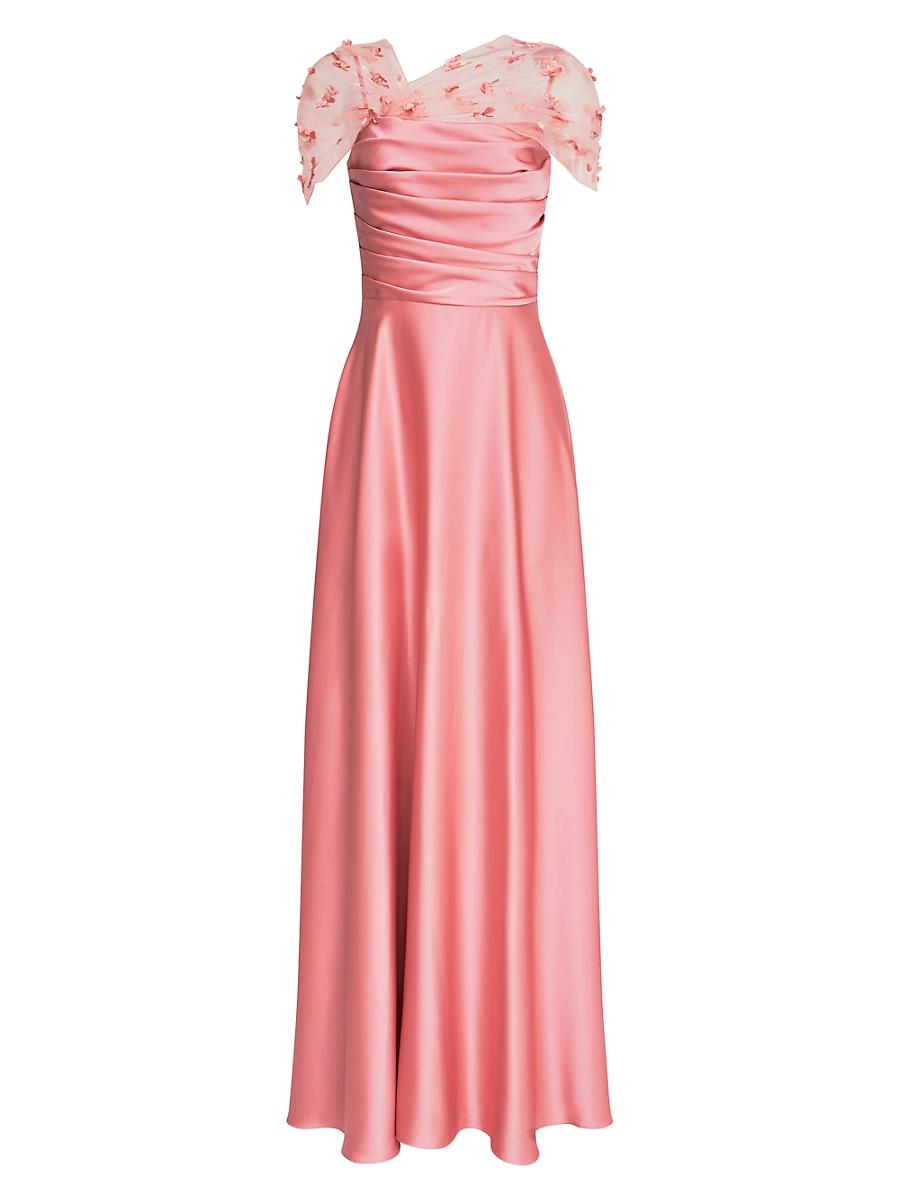 Crafted of double-faced satin, Theias Luella A-line gown showcases a petal-embroidered sheer shawl wrap at the yoke. This romantic piece features a gathered bodice, adjustable straps, and a flowing floor-length skirt. Straightneck Asymmetric shawl yoke Adjustable straps Back zip closure 100% polyester Spot clean Imported SIZE & FIT About 62.25 from shoulder to hem Model measurements: 510 tall Model is wearing a US size 4 ABOUT THE BRAND Inspired by the Greek goddess of sight, designer Don ONeill launched Theia in 2009 in hopes that his elegant evening dresses would bring out every womans inner goddess. Occasionwear at its finest, the brands gowns are crafted of luxurious silks, with brocades and laces embellished with stunning beading and embroidery. Dress Collections - Theia > Theia > Saks Fifth Avenue > Barneys. Theia. Color: Sugar Coral. Size: 16.