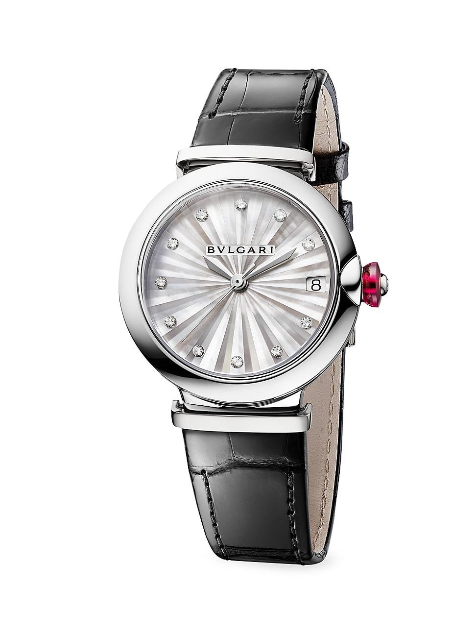 From the Lvcea Collection. Inspired by light and time, this streamlined timepiece features glittering diamond detailing. Automatic movement Stainless steel bezel Stainless steel crown Scratch-resistant sapphire crystal with anti-reflective coating Mother-of-pearl sunray dial Diamond hour indexes, 0.25 tcw Date display at 3 oclock Stainless steel case Alligator strap Steel ardillon clasp Made in Switzerland FEATURES Water resistant to 30 m SIZE Round case, 33mm (1.3) ABOUT THE BRAND Founded in Italy in 1884 by Greek silversmith Sotirio Bulgari, BVLGARI has become synonymous with unparalleled craftsmanship and exquisite jewelry. The brands Roman heritage can be seen in pieces inspired by the citys architecture, artwork and ancient mosaics. Today, the house continues to translate its rich history into opulent designs and fragrances. Fine Jewelry - Bvlgari Watches And Jewe > Bvlgari > Saks Fifth Avenue > Barneys. BVLGARI. Color: Steel.