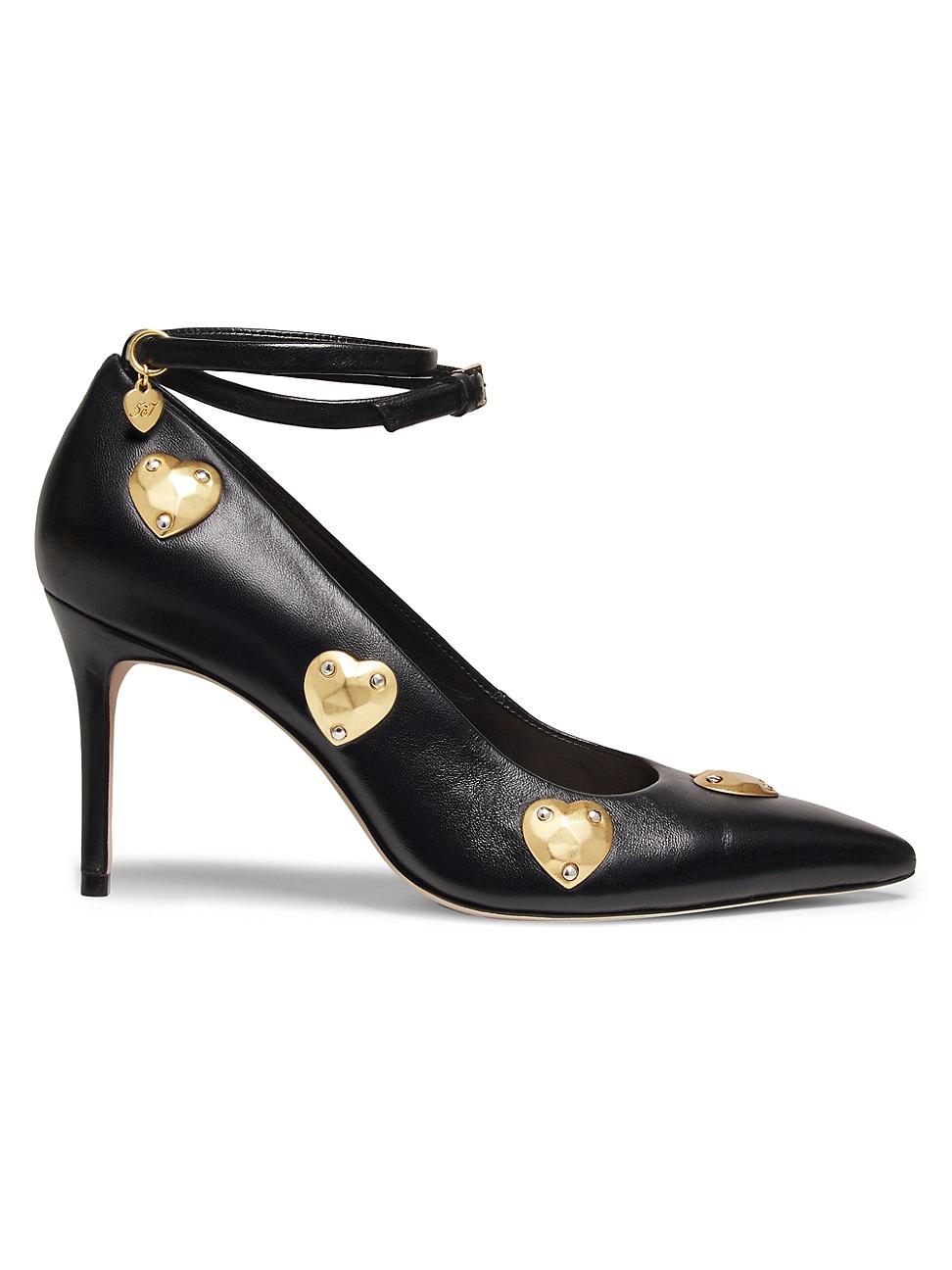Cinq Septs Madison pumps are crafted of leather and accented with heart-shaped metallic hardware. The pair features an adjustable ankle strap and a covered stiletto heel. Point toe Buckle closure Leather upper Leather lining Leather sole Imported SIZE Self-covered heel: about 3.35 (85mm). Womens Shoes - Workshop Shoes > Cinq Sept > Saks Fifth Avenue > Barneys. Cinq Sept. Color: Black Gold. Size: 9.