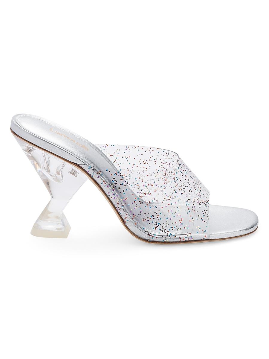 Anchored by a sculptural heel, Larroudes Madonna Lucite mules boast a glitter embellished vinyl vamp strap. This statement pair is set on an eye-catching metallic leather footbed. Vinyl upper Round toe Slip-on style Leather sole Imported SIZE Sculptural heel, 3.75. Womens Shoes - Contemporary Shoes > Larroud > Saks Fifth Avenue > Barneys. Larroud. Color: Glitter Silver. Size: 9.