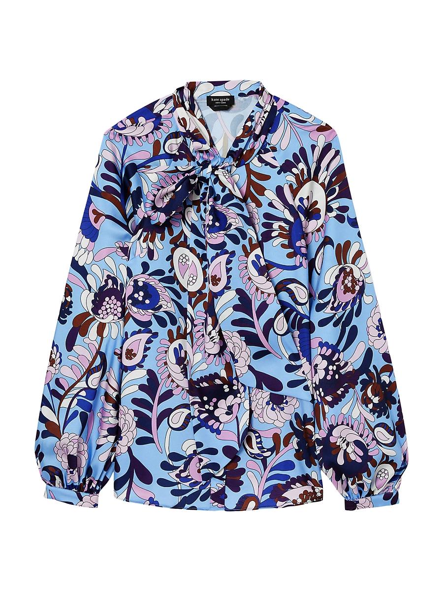 Featuring a bold autumn paisley print, this Kate Spade New York shirt is styled with a tie neck and long blouson sleeves. Tie neck Long blouson sleeves Button-front closure 100% polyester Dry clean Imported SIZE & FIT Model measurements: 510 tall Model is wearing a US size Small. Modern Collections - Branded Separates > Kate Spade New York > Saks Fifth Avenue > Barneys. kate spade new york. Color: Astral Blue Multi. Size: Small.