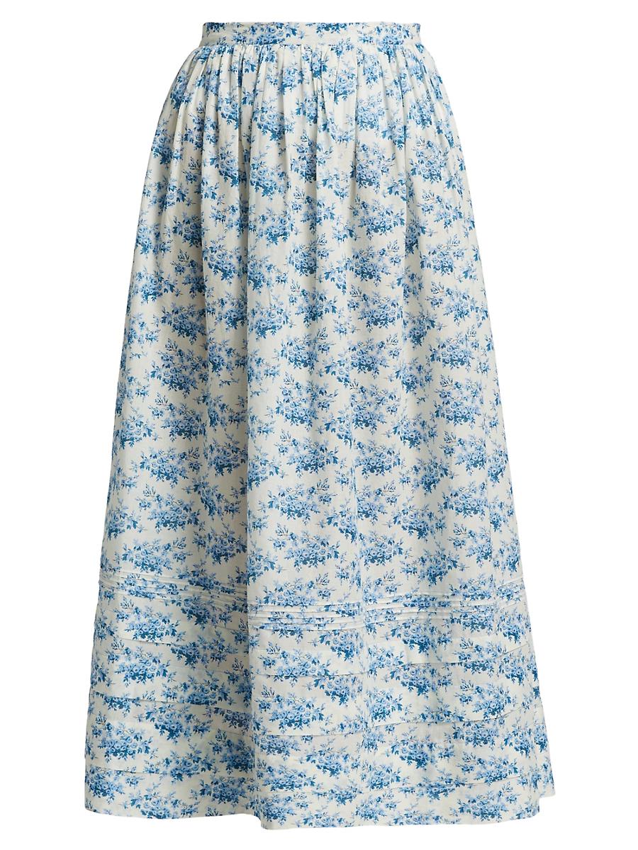 Crafted of cotton, the Marcie midi-skirt from DEN is adorned with a sweet floral print and features pleating at the banded waist. Made with organic cotton Banded waist Concealed zip closure 100% organic cotton, exclusive of trim Dry clean Imported SIZE & FIT About 35 length Model measurements: 510 tall Model is wearing a US size Small. Contemporary Sportswear - Workshop > Den > Saks Fifth Avenue > Barneys. DEN. Color: Bleu Rosier Floral. Size: Large.