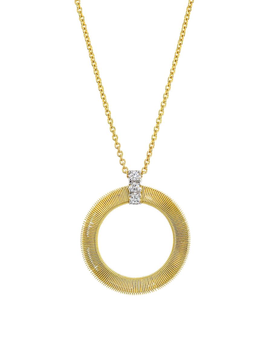 From the Masai Collection. A coiled circular pendant with delicate diamond details elevate this necklace. Since 2000, Marco Bicego has incorporated traditions and virtues passed down by his father, handcrafting jewelry that embodies Italian craftsmanship and contemporary design. 18K yellow gold Diamonds, 0.09 tcw Diamond clarity, VS1 Diamond color, G Lobster clasp Made in Italy SIZE Pendant width, about 1 Length, about 16.5 ABOUT THE BRAND Marco Bicego first started learning the art of goldsmithing from his father, and ultimately formed his own brand in 2000 in Trissino, Italy. All crafted in 18K gold, the brand is most known for its handmade pieces in engraved and coil finishes, as well as vibrant semi-precious jewels. Marco has created his brand to be versatile, so one can mix and match collections for daily wear. Fine Jewelry - Marco Bicego A > Marco Bicego > Saks Fifth Avenue > Barneys. Marco Bicego. Color: Gold.