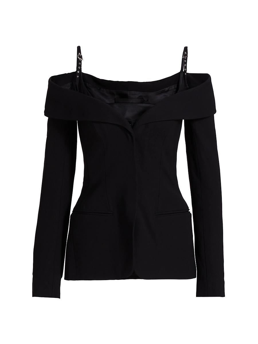 Muglers Matte off-the-shoulder jacket showcases polished lapels and adjustable buckle shoulder straps. Off-the-shoulder neck Shoulder straps Long sleeves Front besom pockets Concealed front closure 100% cupro Combo: 76% viscose/24% wool Trim: 83% polyamide/17% elasthane Dry clean Imported SIZE & FIT Model measurements: 510 tall Model is wearing a US size 4. Advanced Designer - Designer Emerging Brands > Mugler > Saks Fifth Avenue > Barneys. Mugler. Color: Black. Size: 10.