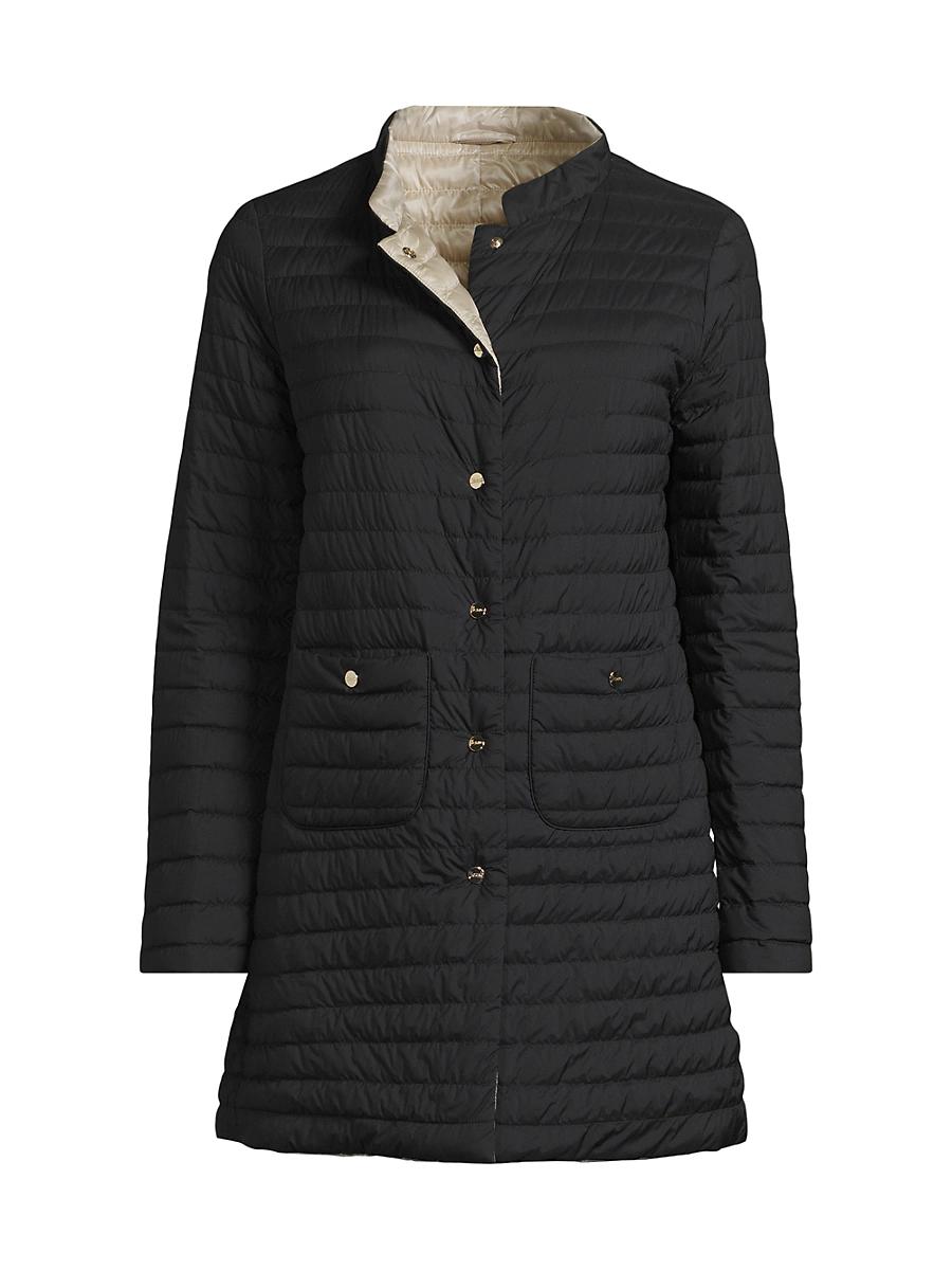 This reversible quilted coat from Herno is characterized by a contemporary twist that allows an easy switch from a matte outer shell to a high-shine finish for ultimate versatility. Stand collar Long sleeves Front snap pockets Side on-seam pockets Front snap closure 100% polyamide Combo:100% polyamide Filling: 90% down/10% feather Dry clean Imported SIZE & FIT Model measurements: 510 tall Model is wearing a US size Small. Outerwear And Swimwear - Down > Herno > Saks Fifth Avenue > Barneys. Herno. Color: Black Champagne. Size: 4.