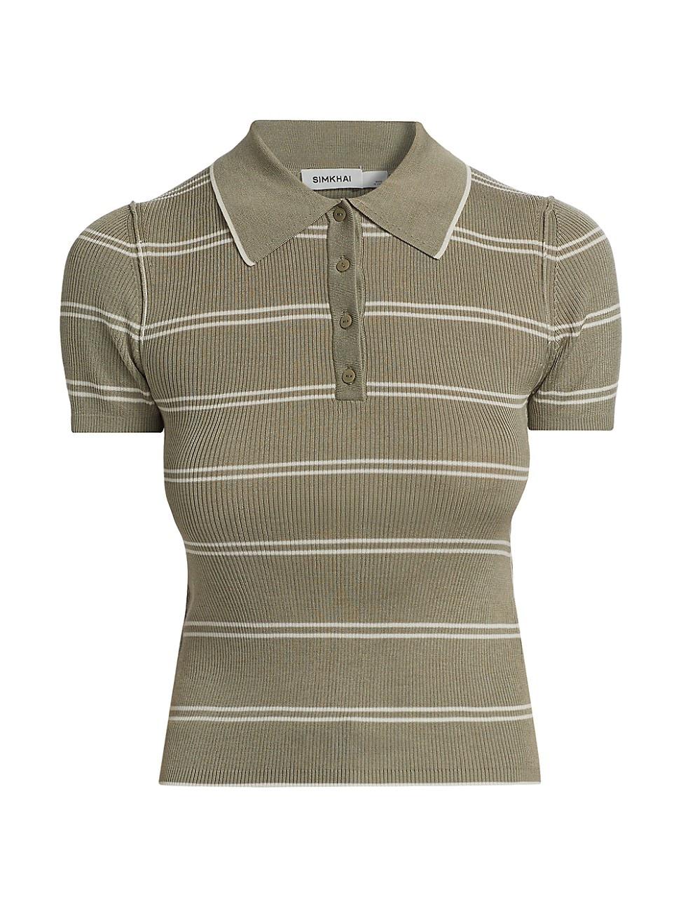 Crafted of a silk-cashmere blend, the Matty polo shirt by SIMKHAI showcases a ribbed design and a striped pattern. Point collar Short sleeves Button-front placket 85% silk/15% cashmere Dry clean Imported SIZE & FIT About 21.25 from shoulder to hem Model measurements: 510 tall Model is wearing a US size Small. Contemporary Sportswear - Workshop > Simkhai > Saks Fifth Avenue > Barneys. SIMKHAI. Color: Sage Stripe. Size: XL.