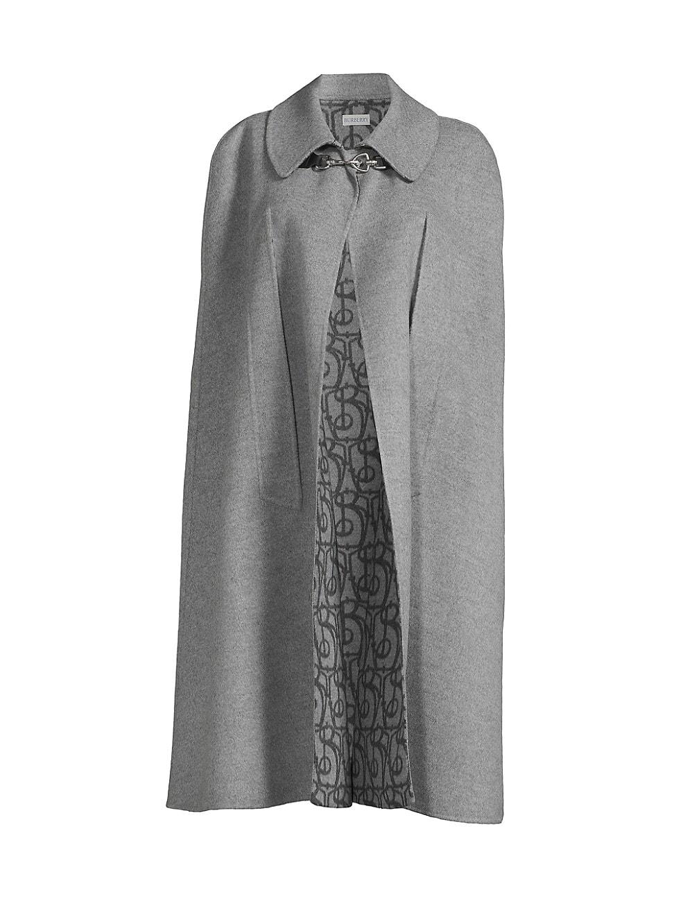 Crafted of a double-faced blend of Italian cashmere, wool, and silk, the Maud cape from Burberry features a jacquard-woven B charm pattern at the inner. This style is finished with exaggerated front slits and is secured with a horse-shaped clip inspired by the brands signature Equestrian Knight Design. 92% wool/7% cashmere/1% silk Trim: 100% calf leather Dry clean Made in Italy SIZER Length: about 41 ABOUT THE BRAND Founded in 1856 by 21-year-old Thomas Burberry, the brand set out with a mission to stylishly protect against British weather-and Burberrys iconic trench coat was born. In the 1920s, its renowned check pattern was introduced as the coats lining. Today, under Creative Director Daniel Lee, the heritage brand continues to evolve and create timelessly classic mens, womens and kids pieces, along with beauty. Soft Accessories - Burberry Soft Accessorie > Burberry > Saks Fifth Avenue > Barneys. Burberry. Color: Iron Grey. Size: Medium.
