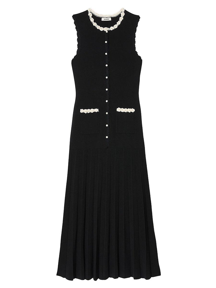 Sleeveless stretch-knit maxi dress with round neck, button placket, pleated skirt, patch pockets and contrasting crochet detailing on edges and pockets. E25BLOSSOM Sandro Womens knit maxi dress Crochet and beaded edges Round neck Sleeveless Button placket 2 patch pockets Pleated skirt hem Hook-and-eye-fastening with beads Main fabric: 52% viscose, 46% polyamide, 2% elastane Model measurements: 59 Model is wearing a size 4 Imported. Lsd Rtw - Sandro > Sandro > Saks Fifth Avenue > Barneys. Sandro. Color: Black. Size: 6.