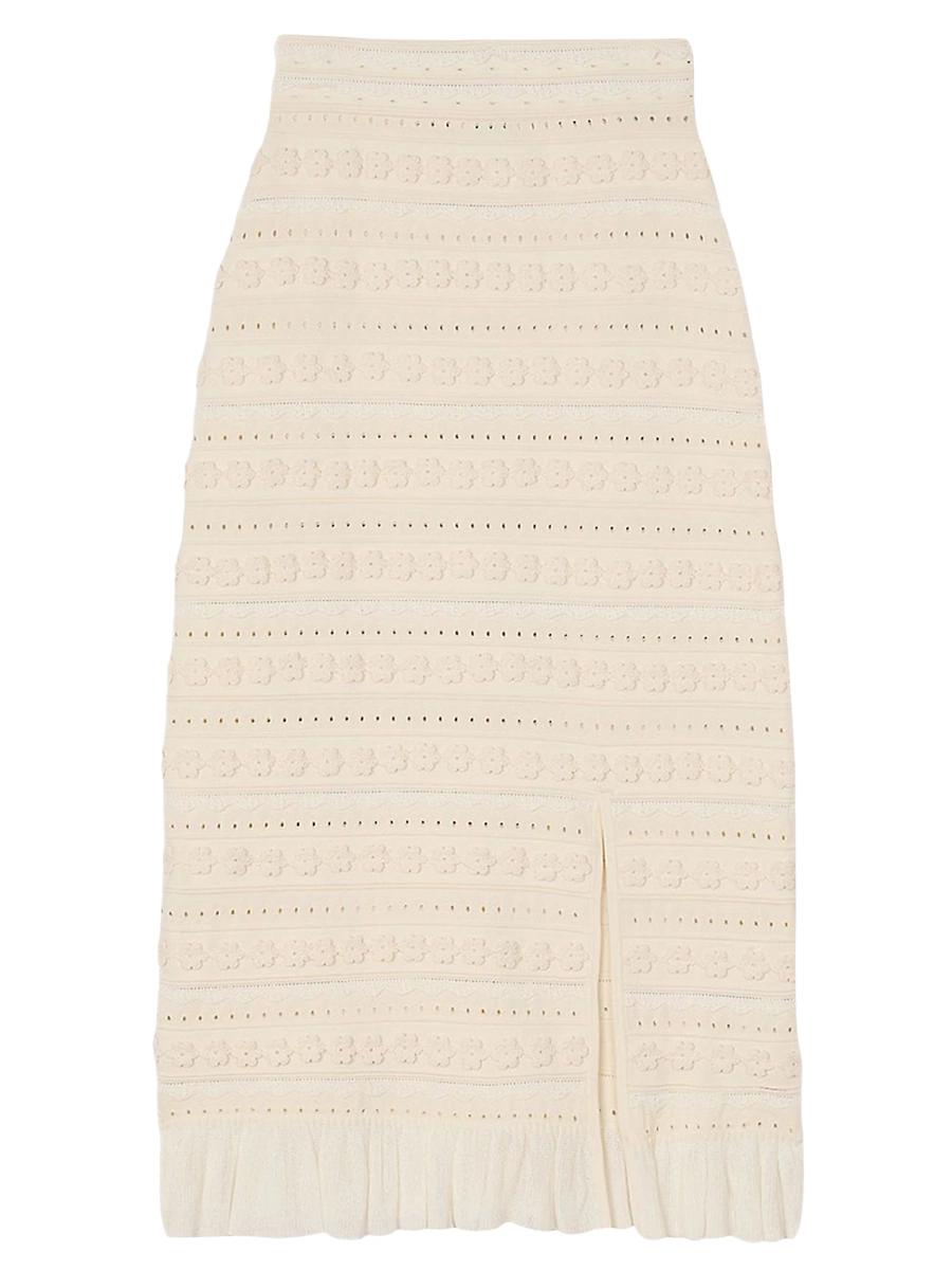 Long skirt in fancy knit with crochet detailing, featuring a slit at the front and a ruffle at the bottom. E25SARTENE Sandro Womens decorative knit maxi skirt Crochet flower details Front slit Ruffled bottom Main fabric: 57% viscose, 42% polyamide, 1% elastane Ruffle: 69% viscose, 31% polyamide Appliqu: 55% viscose, 45% polyamide Imported SIZE & FIT Model measurements: 58 Model is wearing a size 36. Lsd Rtw - Sandro > Sandro > Saks Fifth Avenue > Barneys. Sandro. Color: Ecru. Size: 2.