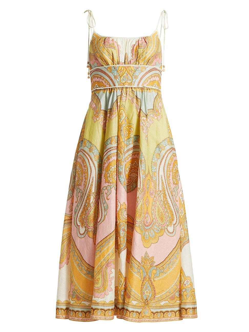 Crafted of paisley linen, Zimmermanns Maxine midi-dress is styled with a scoopneck, spaghetti straps, and side slip pockets. Halterneck Spaghetti straps Sleeveless Side slip pockets Smocked back Back zip closures 100% linen Dry clean Imported SIZE & FIT Model measurements: 510 tall Model is wearing a US size 4 ABOUT THE BRAND Australian founders and sister-duo Nicky and Simone Zimmermann design with a signature feminine aesthetic, each piece rife with tiers of fabric, rich embroidery and splashy prints. From ruffled bikinis and beachwear to luxe, intricately patterned maxi (and mini) dresses, everything is overtly romantic in the most elevated, effortless way. Outerwear And Swimwear - Contemporary Swim > Zimmermann > Saks Fifth Avenue > Barneys. Zimmermann. Color: Gold Paisley. Size: 6.