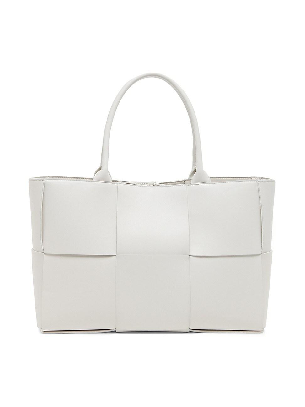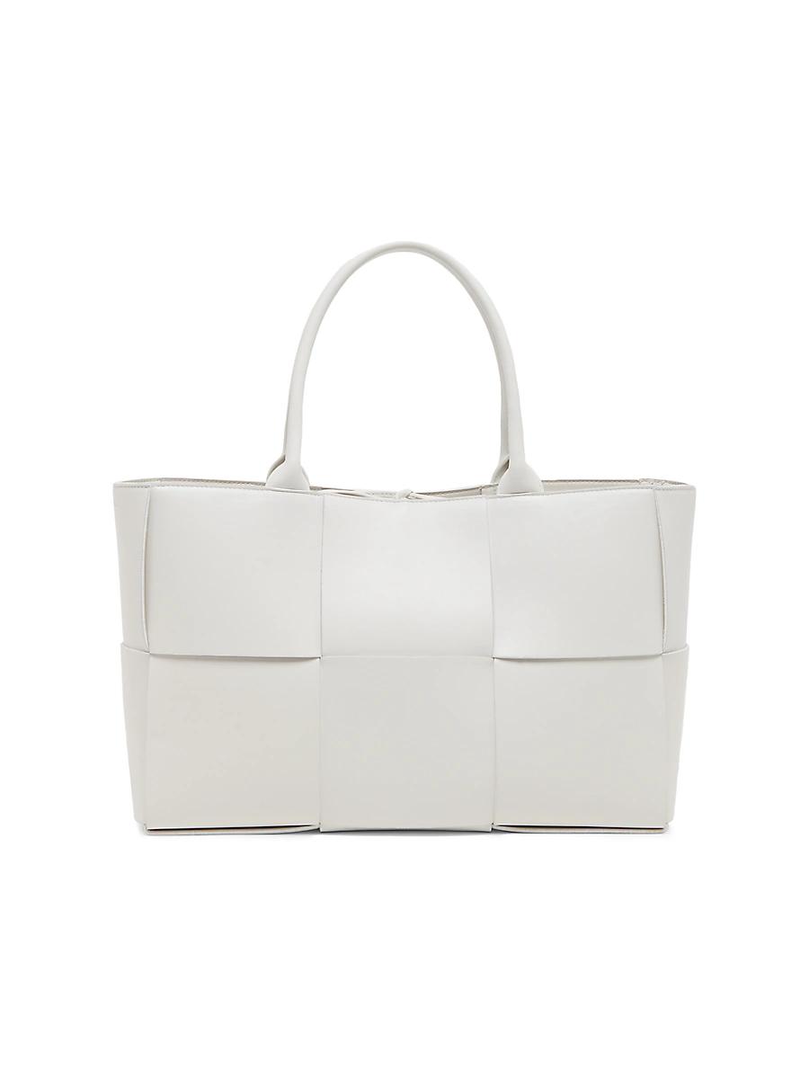 A large-scale woven design elevates this chic leather tote, complete with zippered pouch. Dual top handle Open top with self-tie closure One interior compartment Interior zip pouch Leather Made in Italy SIZE 16.25W x 16.25H x 5.5D ABOUT THE BRAND Founded in 1966, the label known for fine Italian craftsmanship with creativity at its core has since catapulted to cult-level status. The houses storied intrecciato pattern in shoes and handbags, alongside its signature minimalist ready-to-wear, have made the label an editor and It-girl favorite. Handbags - Bottega Veneta Handbags > Bottega Veneta > Saks Fifth Avenue > Barneys. Bottega Veneta. Color: Chalk Silver.