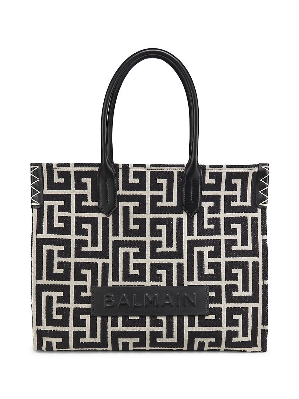 Balmains B-Army Shopper is a medium-sized bag crafted in Italy from a blend of cotton. The design features the brands iconic monogram jacquard pattern, offering a stylish and practical addition to any outfit. Two top handles Interior: one slip pocket Removable coin pouch Hook closure Made in Italy SIZE About 16.5W x 13.5H x 6.3D ABOUT THE BRAND In 1945, founder Pierre Balmain made his well-received debut of opulent, ultra-feminine designs. Known today for its iconic blazers, impeccably constructed dresses and signature fragrances, the brand continues its dedication to masterful tailoring and elegance under the helm of Creative Director Olivier Rousteing. Handbags - Advanced Designer Handba > Balmain > Saks Fifth Avenue > Barneys. Balmain. Color: Ivory Noir.