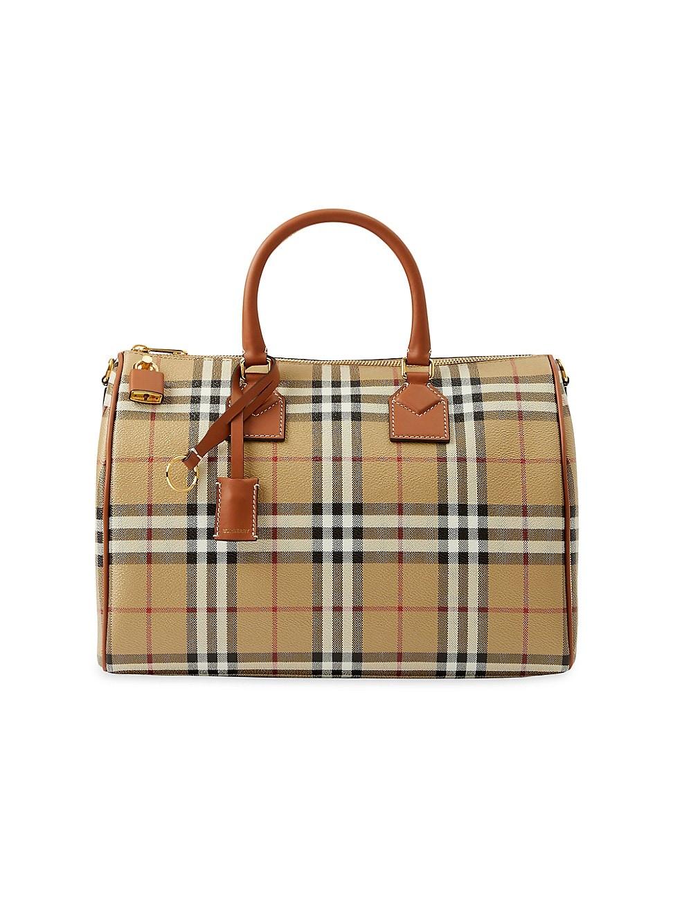 Crafted of coated canvas, this bowling back from Burberry features a signature check pattern and leather-wrapped padlock hardware. Two top handles Adjustable, removable shoulder strap Top-zip closure 54% polyurethane/35% cotton/11% polyester Lining: 100% cotton Trim: leather Made in Italy SIZE About 11.75W x 8.25H x 6D Adjustable, removable shoulder strap, about 14.75-16.75 drop ABOUT THE BRAND Founded in 1856 by 21-year-old Thomas Burberry, the brand set out with a mission to stylishly protect against British weather-and Burberrys iconic trench coat was born. In the 1920s, its renowned check pattern was introduced as the coats lining. The heritage brand now offers handbags, beauty and kids ready-to-wear, and under Creative Director Riccardo Tisci, the brand continues to evolve and create timelessly classic pieces. Handbags - Burberry Handbags > Burberry > Saks Fifth Avenue > Barneys. Burberry. Color: Archive Beige.