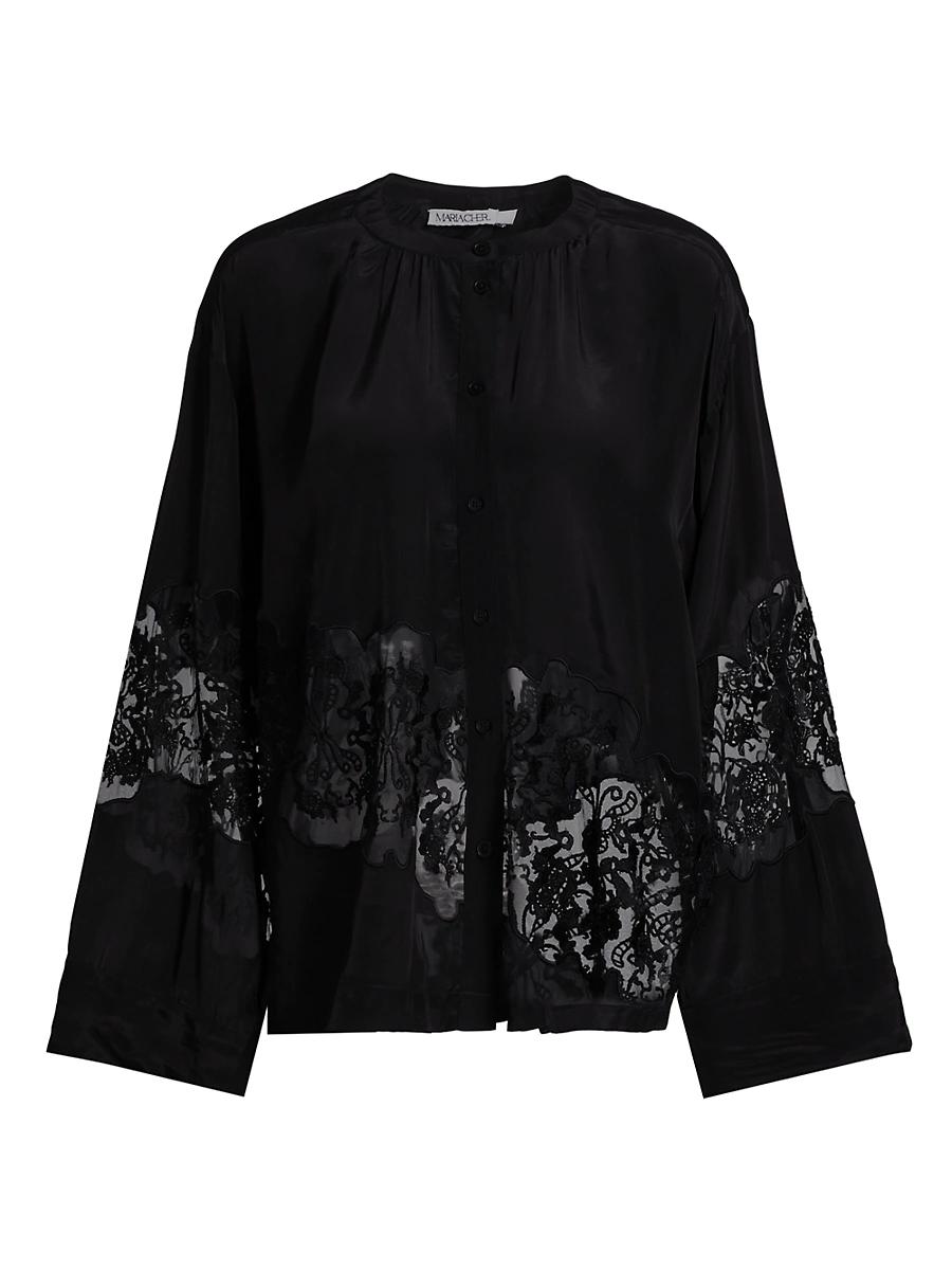 Maria Chers Mellado Remy blouse showcases a satin-finished design with open lace details. Tailored with a loose fit, this piece features a banded collar, long sleeves, and button cuffs. Band collar Long sleeves, button cuffs Button-front closure 100% viscose Lining: 100% viscose Hand wash Imported SIZE & FIT About 17 from shoulder to hem Model measurements: 510 tall Model I swearing a US size Small. Contemporary Sportswear - Contemporary Collections > Maria Cher > Saks Fifth Avenue > Barneys. Maria Cher. Color: Black. Size: XS.