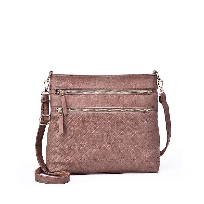Accessorize in style, thanks to Karla Hanson. Accessorize in style, thanks to Karla Hanson. HANDBAG FEATURES Gold-tone hardware Woven pattern, removable handle and strapHANDBAG DETAILS 11H x 12.5 W x 1D Crossbody strap: 23 - 25.5 Removable/adjustable crossbody strap Closure type: Zipper Exterior: 3 zip pockets Interior: 1 zip pocket, 1 slip pocketCONSTRUCTION & CARE Faux Leather Lining: polyester Spot clean Imported Size: One Size. Color: Brown. Gender: female. Age Group: adult.