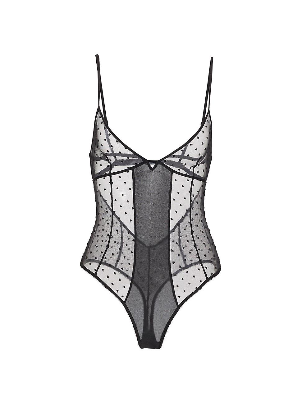 Crafted of sheer tulle, Kiki de Montparnasses Merci bodysuit features a solid front panel and swiss-dot detailing. Adjustable straps and micro-scallop trim complete the look. V-neck Sleeveless Adjustable straps Thong back Pulls on Tulle: 56.1% polyamide/22.9% elastane/21% polyester Emboridery: 100% polyester Combo: 90% silk/10% elastane Gusset: 100% cotton Dry clean Imported SIZE & FIT Model measurements: 510 tall Model is wearing a US size Small. Lingerie - Designer Foundations > Kiki De Montparnasse > Saks Fifth Avenue > Barneys. Kiki de Montparnasse. Color: Black. Size: Large.