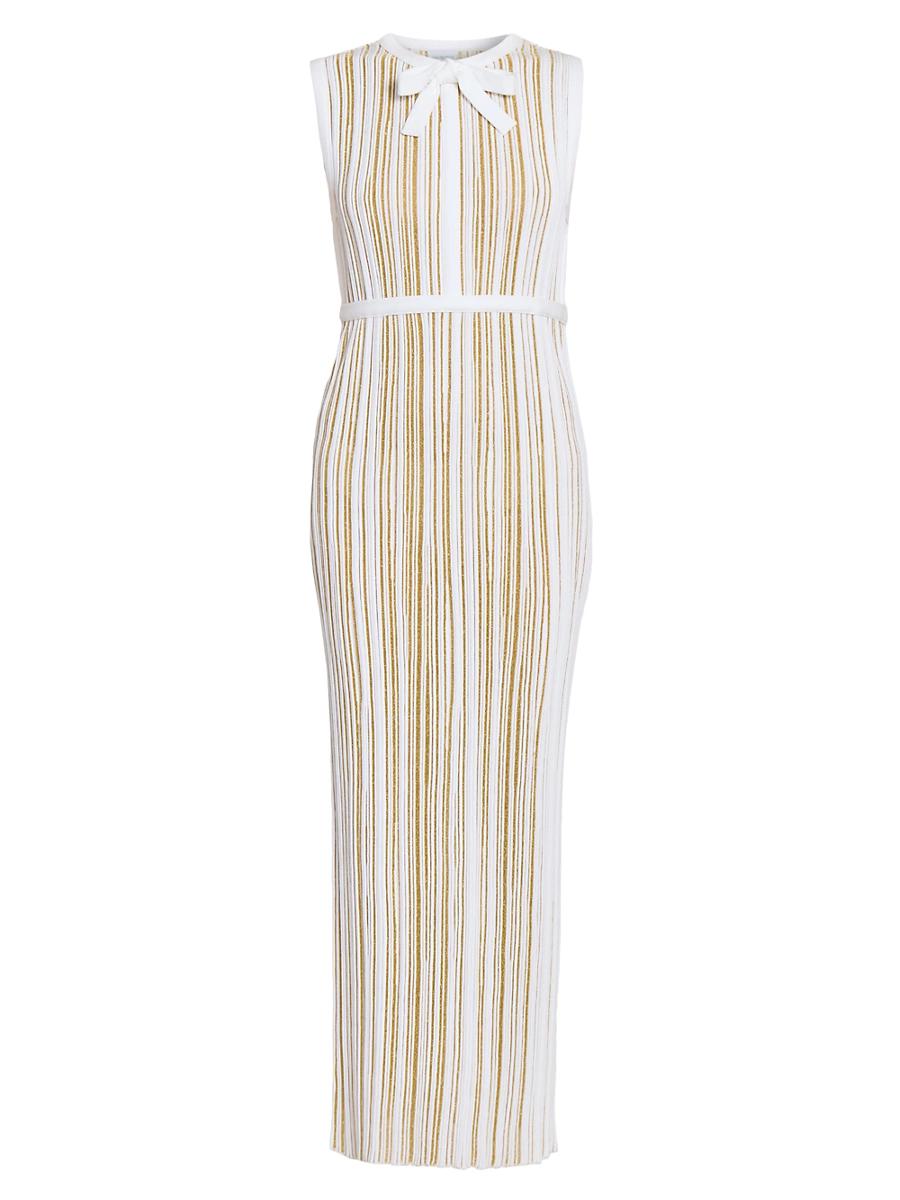 Finished in a stretchy pliss highlighted by metallic stripes, Giambattista Vallis fitted midi-dress showcases a charming crewneck with a ribbon bow accent and defined banded waist. Crewneck, ribbon bow Sleeveless Banded waist Pulls over 64% viscose/30% polyester/6% nylon Dry clean Made in Italy SIZE & FIT Model measurements: 510 tall Model is wearing a US size 4. Advanced European - Giambattista Valli > Giambattista Valli > Saks Fifth Avenue > Barneys. Giambattista Valli. Color: Gold Ivory. Size: 6.