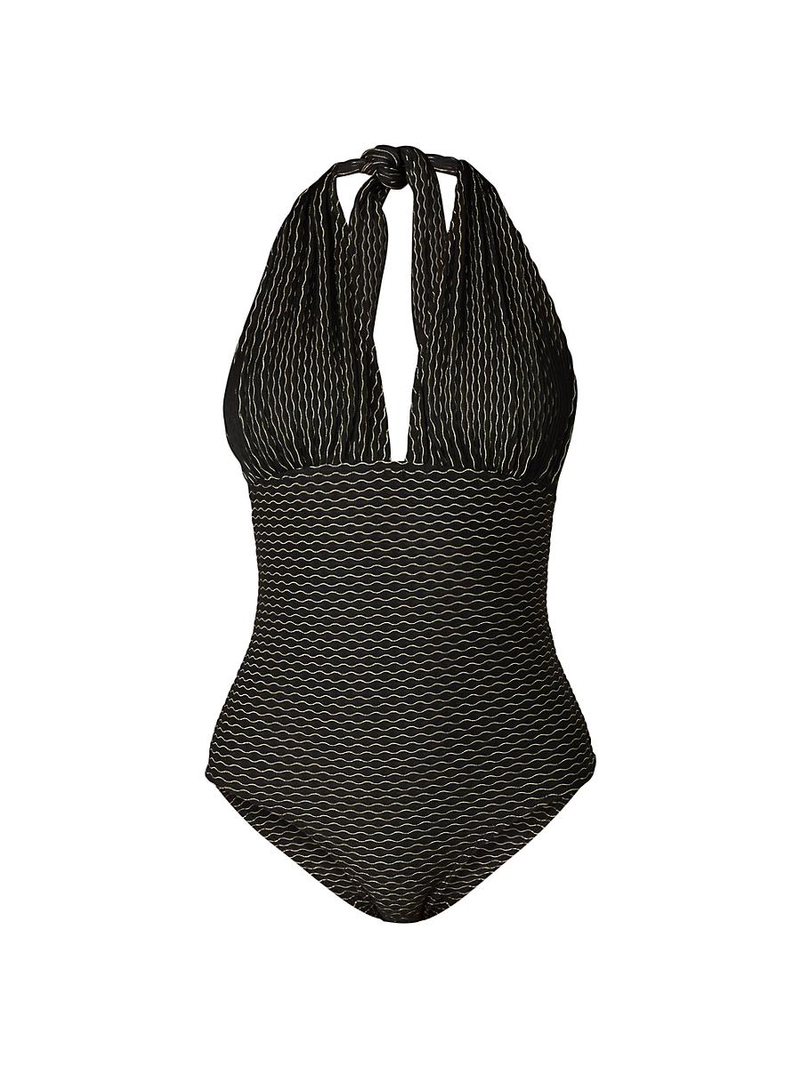 Designed with wavy metallic stripes, this one-piece swimsuit from Shoshanna features a plunging V-halterneck. Plunging V-halterneck Halter tie straps Pulls on 89% nylon/8% spandex/3% metallic polyester Lining: 95% polyester/5% spandex Hand wash Made in USA SIZE & FIT Model measurements: 510 tall Model is wearing a US size 4. Outerwear And Swimwear - Contemporary Swim > Shoshanna > Saks Fifth Avenue > Barneys. Shoshanna. Color: Jet Gold. Size: 4.
