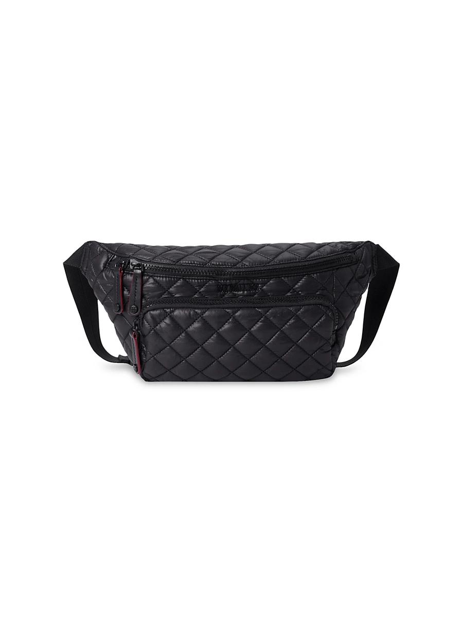 This quilted nylon sling bag features signature red leather trim. Adjustable waist strap Top zip Two exterior pockets Four interior pockets Textile Trim: Leather Imported SIZE 14W x 6H x 2.75D. Handbags - Contemporary Handbags > Mz Wallace > Saks Fifth Avenue > Barneys. MZ Wallace. Color: Black Oxford.