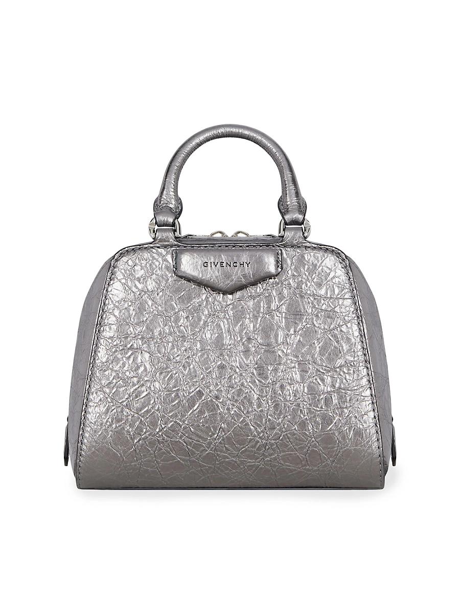 Micro Antigona Cube Bag. Micro handbag or crossbody bag in laminated lambskin Antigona cube line Modular cubic shape thanks to origami-style gusset construction Zipper closure with Givenchy 4G zipper pull Articulated leather handles with four D-Rings for the shoulder strap Adjustable and removable leather shoulder strap Pentagonal patch with silvery embossed Givenchy signature on the front and 4G emblem on the back Silvery-finish metal details One main compartment with one card slot inside Composition: 100% lambskin Made in Italy 6.69 x 5.51 x 4.33. Lsd Handbags - Givenchy > Givenchy > Saks Fifth Avenue > Barneys. Givenchy. Color: Silvery Grey.