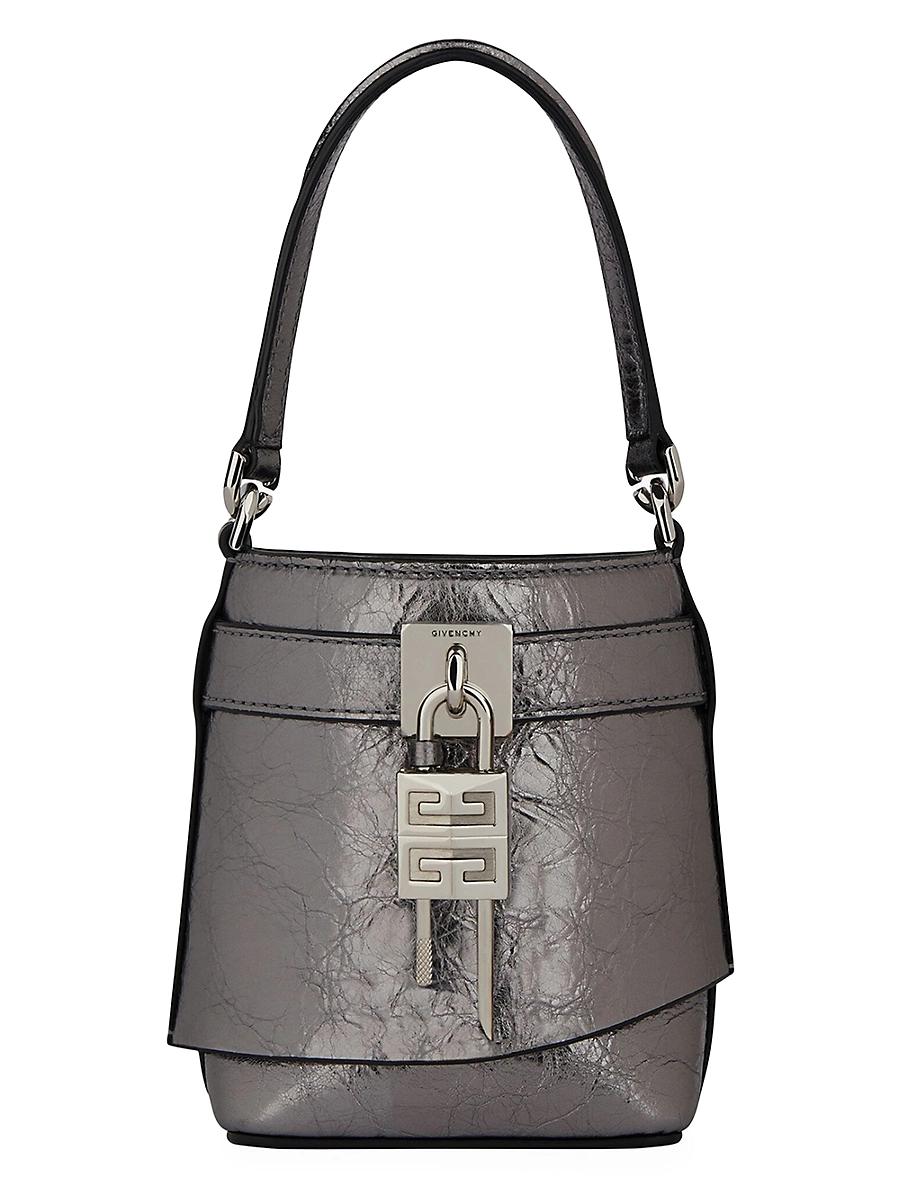 A signature 4G logo padlock matches the shine of the crinkly metallic lambskin that shapes this compact yet structured bucket bag. Open top Top carry handle; removable, chain crossbody strap Structured silhouette with flat base for stability Leather Made in Italy Designer Handbags