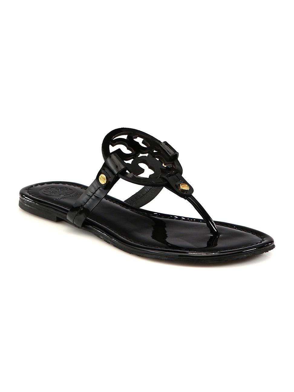 The Tory Burch Miller Flip Flop Sandal offers iconic inspiration with a smooth leather upper, signature medallion logo accent at the vamp, and studded embellishments. Slip-on styling. Open toe with center thong post. Smooth leather lining. Lightly padded leather footbed provides added comfort. Textured synthetic outsole. Imported. Measurements: Weight: 5 oz Product measurements were taken using size 9, width M. Please note that measurements may vary by size.