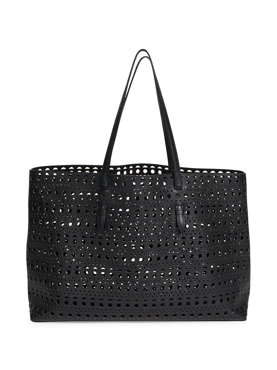 This leather tote bag from Alaa flaunts a signature laser-cut design and a separate zip pouch. Two top handles Separate zip pouch Open top Leather Made in Italy SIZE About 17.25W x 12.5H x 6.25H ABOUT THE BRAND A trained sculptor, Tunisian designer Azzedine Alaa presented his first collection in 1981 after years of creating for others. Revered for his impeccable craftsmanship and signature fit-and-flare dresses, Alaas goal was to make women feel their best. His precision is exemplified by his timeless ready-to-wear and laser-cut accessories. Handbags - European Collection Hdba > Alaa > Saks Fifth Avenue > Barneys. Alaa. Color: Noir.