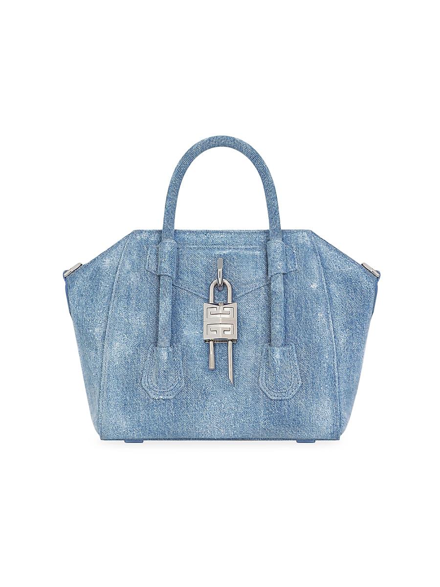 Mini Antigona Lock bag in washed denim. Mini handbag or crossbody bag in washed denim Antigona Lock line Magnetic closure Pentagonal patch with removable 4G padlock on the front Pentagonal patch on the back Washed denim handles. Adjustable and removable denim shoulder strap Silvery-finish metal details One main compartment, one flat pocket and one flat zippered pocket inside Shoulder strap length: 19 in. Handle: 2.8 in 100% cotton Secondary material: 100% calfskin leather Lining: 90% cotton, 10% polyester Dimensions: 11.4 in x 7.9 in x 5.1 in Made in: Italy. Lsd Handbags - Givenchy > Givenchy > Saks Fifth Avenue > Barneys. Givenchy. Color: Medium Blue.