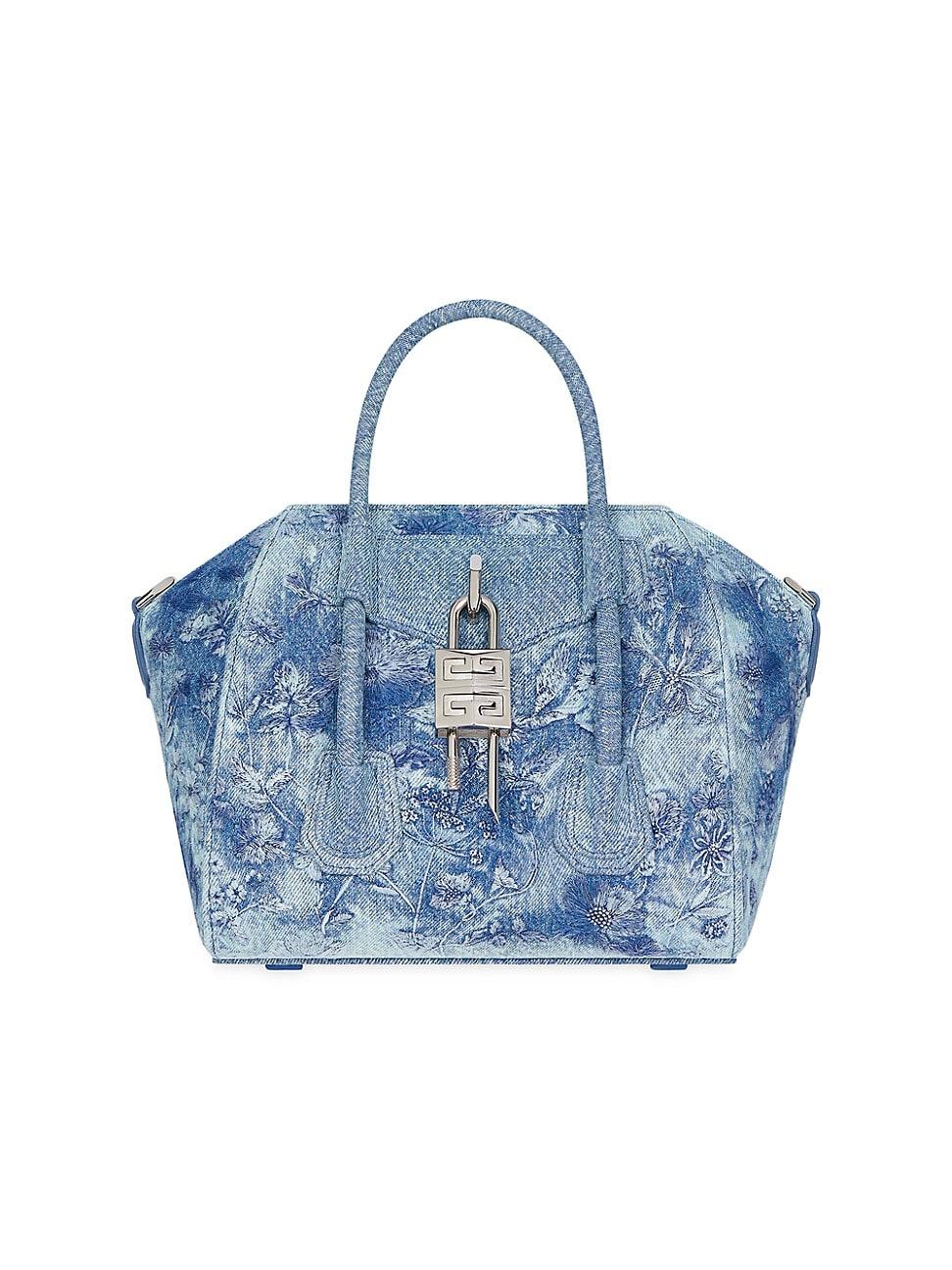 Mini Antigona Lock Bag in washed embroidered denim. Mini handbag or crossbody bag in washed denim with handcrafted floral embroidery Antigona lock line Magnetic closure Adjustable and removable denim shoulder strap Pentagonal patch with removable 4G padlock on the front Silvery-finish metal details One main compartment, one flat pocket and one flat zippered pocket inside Composition: 100% cotton Made in Italy Shoulder strap length: 19 Handle: 28 11.42 in x 7.87 in x 5.12 in. Lsd Handbags - Givenchy > Givenchy > Saks Fifth Avenue > Barneys. Givenchy. Color: Blue.