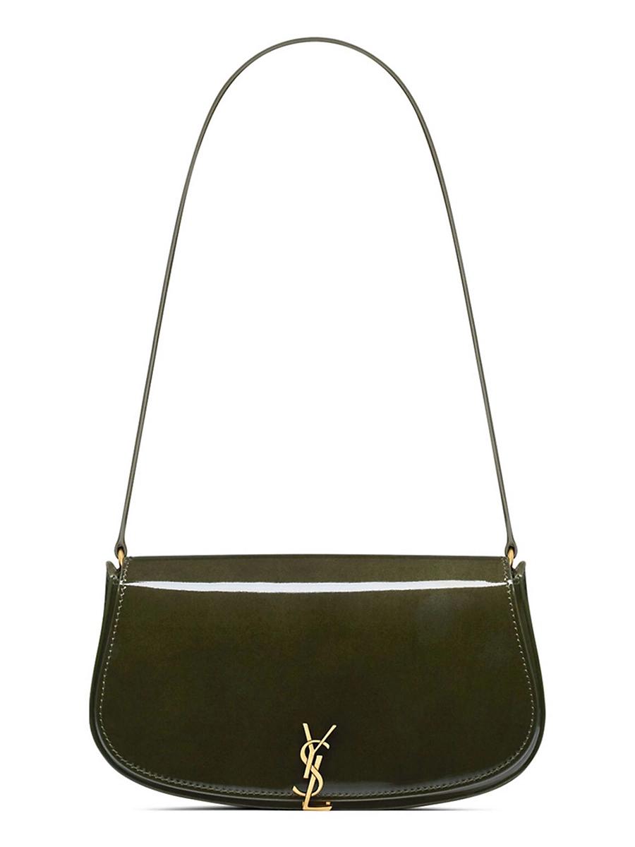 Half-moon shoulder bag in patent leather. This elegant and modern bag features a flap with Cassandre hinge closure. Leather lining Bronze-toned hardware Cassandre hinge closure One flat pocket Dimensions: 20.5 x 12.5 x 4.5 cm / 8.1 x 4.9 x 1.8 Handle drop: 24 cm / 9.4 45% calfskin, 35% lambskin, 10% brass Made in Italy. Lsd Handbags - Saint Laurent > Saint Laurent > Saks Fifth Avenue > Barneys. Saint Laurent. Color: Dark Vineyard Green.