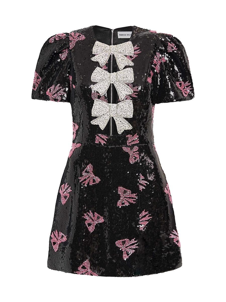 Rebecca Vallances Miya minidress is adorned with hand-laid diamante bow detail and charming sequined bow print. This piece combines a round neckline, voluminous puff sleeves, and a fitted bodice with front cut-outs, cinched waist, and a striking miniskirt with a front split. Round neck Short puff sleeves Back zip closure 97% polyester/3% elastane Lining: 100% polyester Dry clean Imported SIZE & FIT About 33.5 from shoulder to hem Model measurements: 510 tall Model is wearing a US size 4. Dress Collections - Contemporary Evening > Rebecca Vallance > Saks Fifth Avenue > Barneys. Rebecca Vallance. Color: Black. Size: 2.