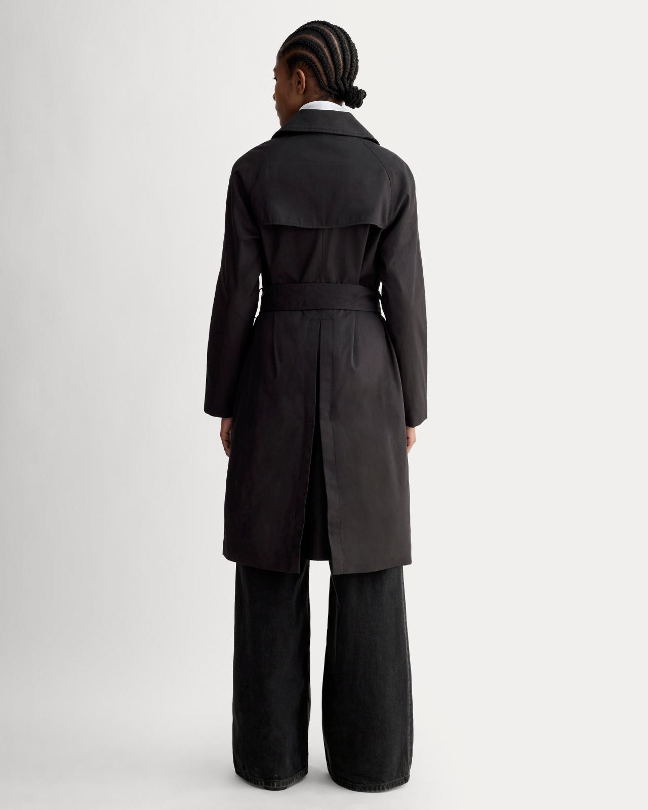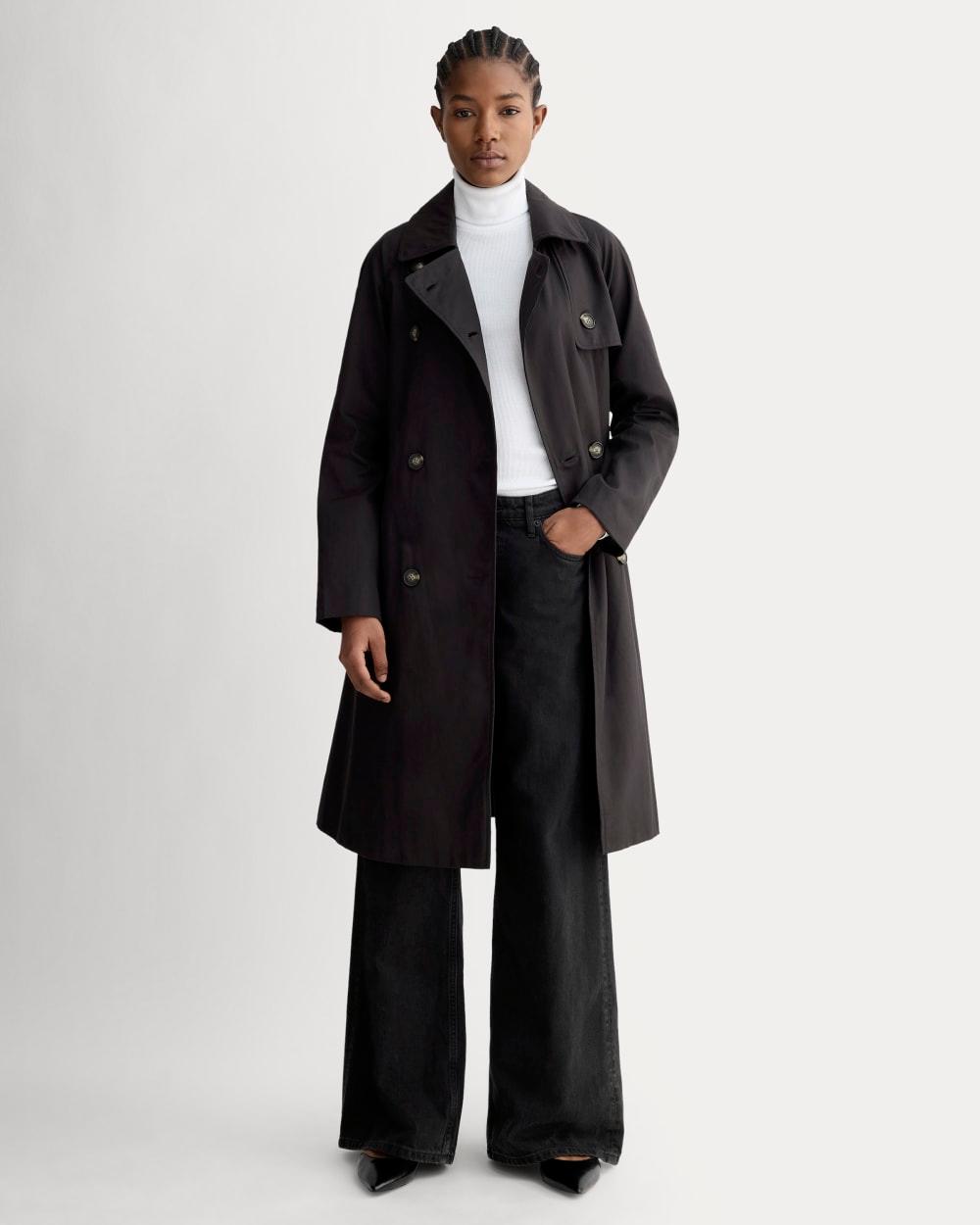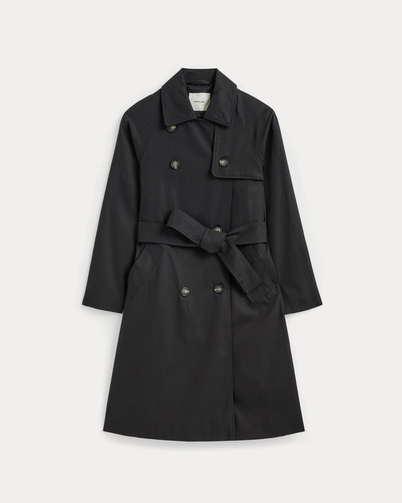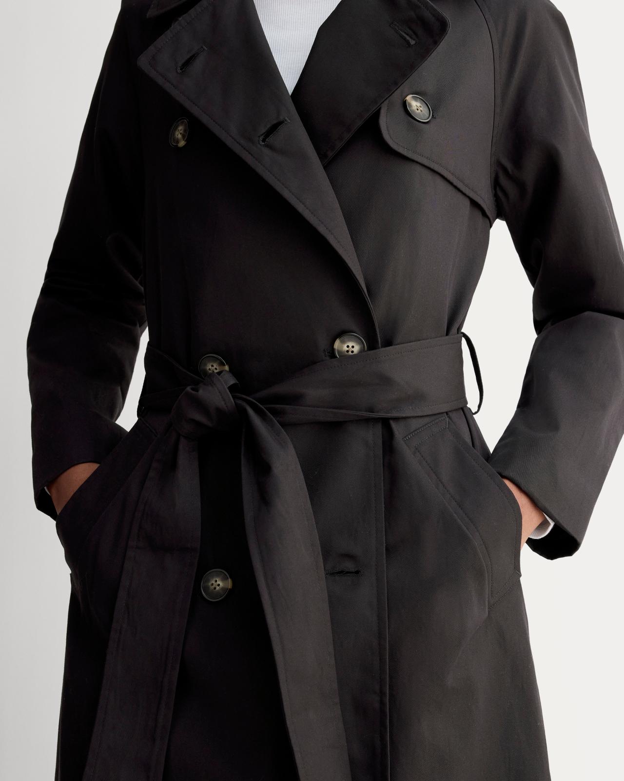 About This Style. This piece features a double-breasted front with button closures and a belt long sleeves a front storm flap detailwith a full back storm flap slanted welt pockets and a back vent with button tab detail. Fully lined its made with 100% organic cotton on the coat itself and 100% recycled polyester in the body lining. Womens Modern Trench Coat by Everlane in Black, Size XXL, Cotton/Polyester