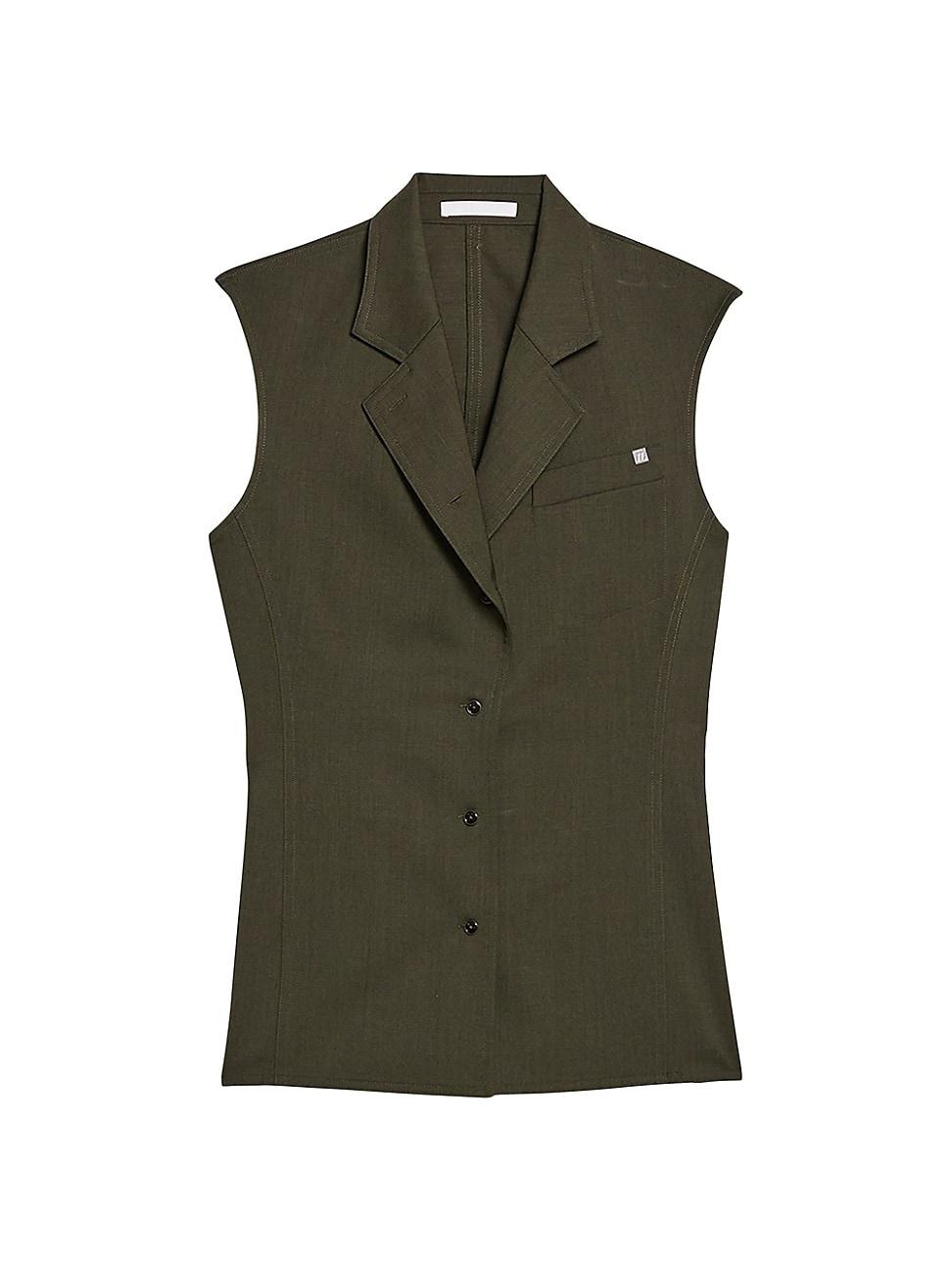 Tailored in lightweight wool, the fitted Modest vest from Helmut Lang is designed with notched lapels and a button-front closure. Notch lapels Sleeveless Shaping darts Button-front closure 100% wool Dry clean Imported SIZE & FIT About 27 from shoulder to hem Model measurements: 510 tall Model is wearing a US size 4. Contemporary Sportswear - Helmut Lang > Helmut Lang > Saks Fifth Avenue > Barneys. Helmut Lang. Color: Green Melange. Size: 4.