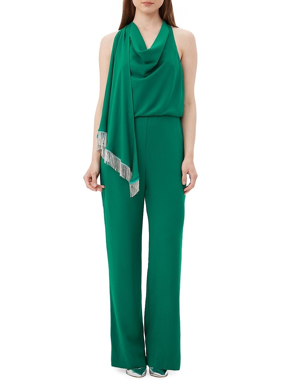 Crafted of silky satin, Trina Turks Momo Fringe jumpsuit features an embellished scarf at the neck and a flattering straight-leg silhouette. Cowlneck with wraparound scarf Sleeveless Concealed side zip closure 100% polyester Dry clean Made in USA SIZE & FIT Rise, about 12.5 Inseam, about 32 Model measurements: 510 tall Model is wearing a US size 4. Dress Collections - Contemporary Dresses > Trina Turk > Saks Fifth Avenue > Barneys. Trina Turk. Color: Emerald. Size: 14.