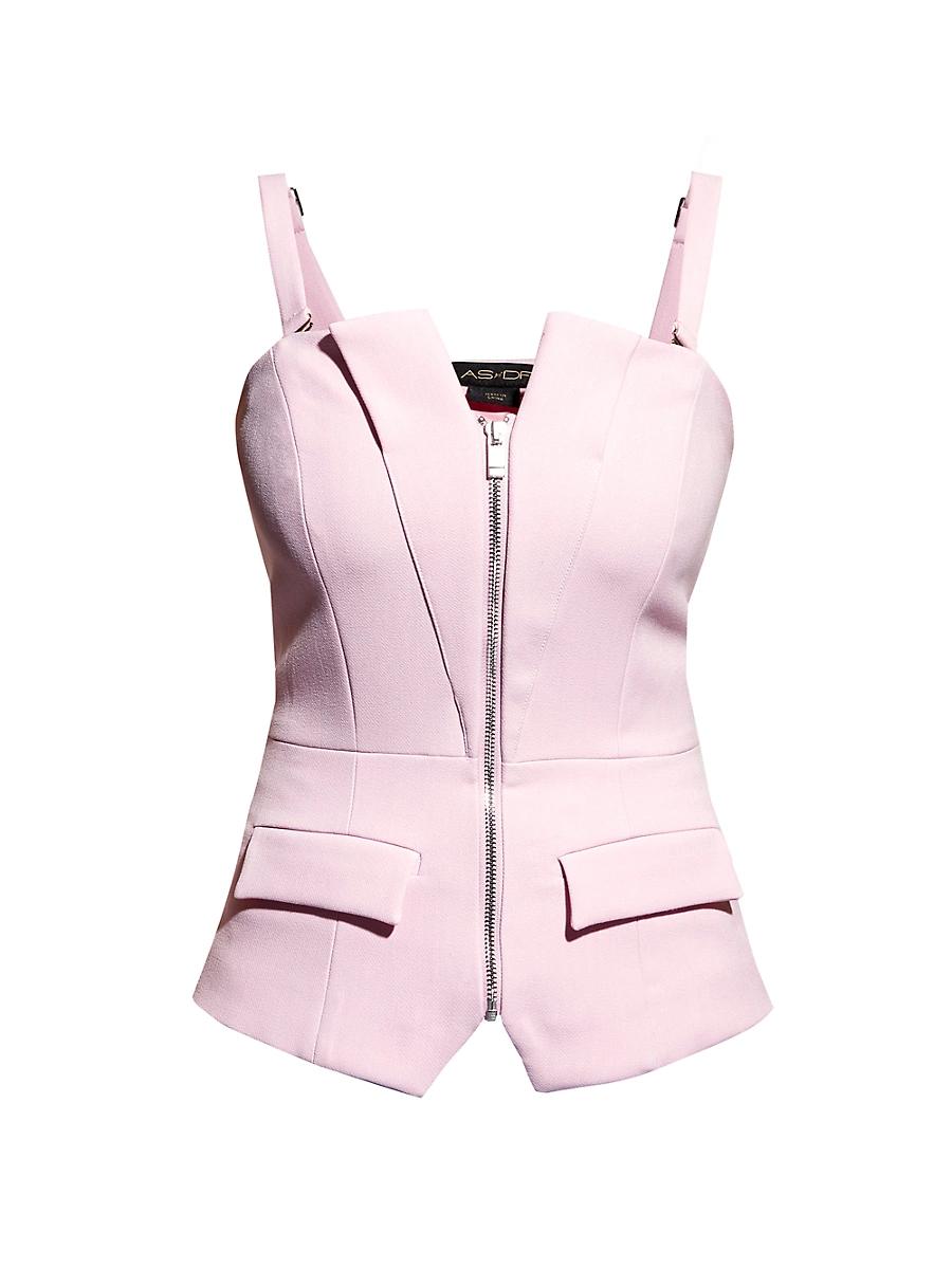 AS by DF Monica structured twill top Approx. 15.8L from shoulder to hem Square neckline with a notched central detail Full front zip Sleeveless Removable adjustable straps Waist flap pockets Hip length Polyester/Promodal rayon Lining: Elastane/polyester Dry clean Imported