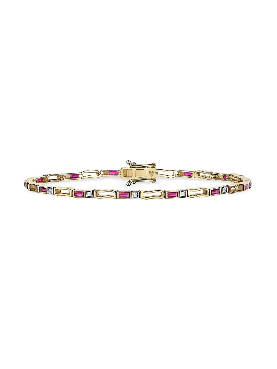 From the Monoglam Collection. Crafted of 14K yellow and white gold, MELIS GORALs bracelet is bezel-set with sparkling baguette rubies and round diamonds. Rubies, 0.75 tcw Diamonds, 0.1 tcw Diamond color grade: G Diamond clarity grade: VS 14K yellow and white gold Box clasp with double safety latch Imported SIZE About 6.8L. Fashion Jewelry - Semi Prec Coll C > Melis Goral > Saks Fifth Avenue > Barneys. Melis Goral. Color: Gold.