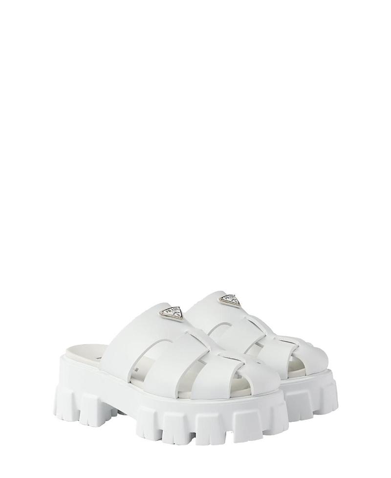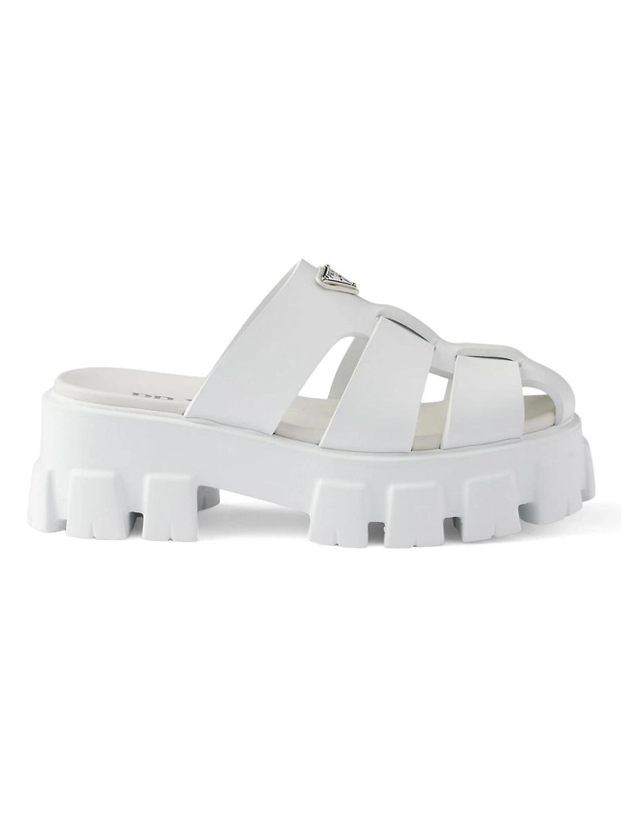 The distinctive Monolith sole, characterized by oversized volumes and architectural lines, defines the silhouette of these rubber mules embellished with the emblematic enameled metal triangle logo. Enameled metal triangle logo Rubber sole: 55 mm / 2.1 Lug tread 100% Ethylene-vinylacetate Imported. Lsd Rtw - Prada Rtw > Prada > Saks Fifth Avenue > Barneys. Prada. Color: White. Size: 5.