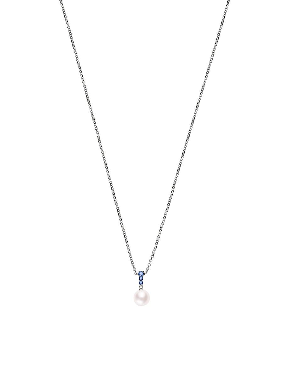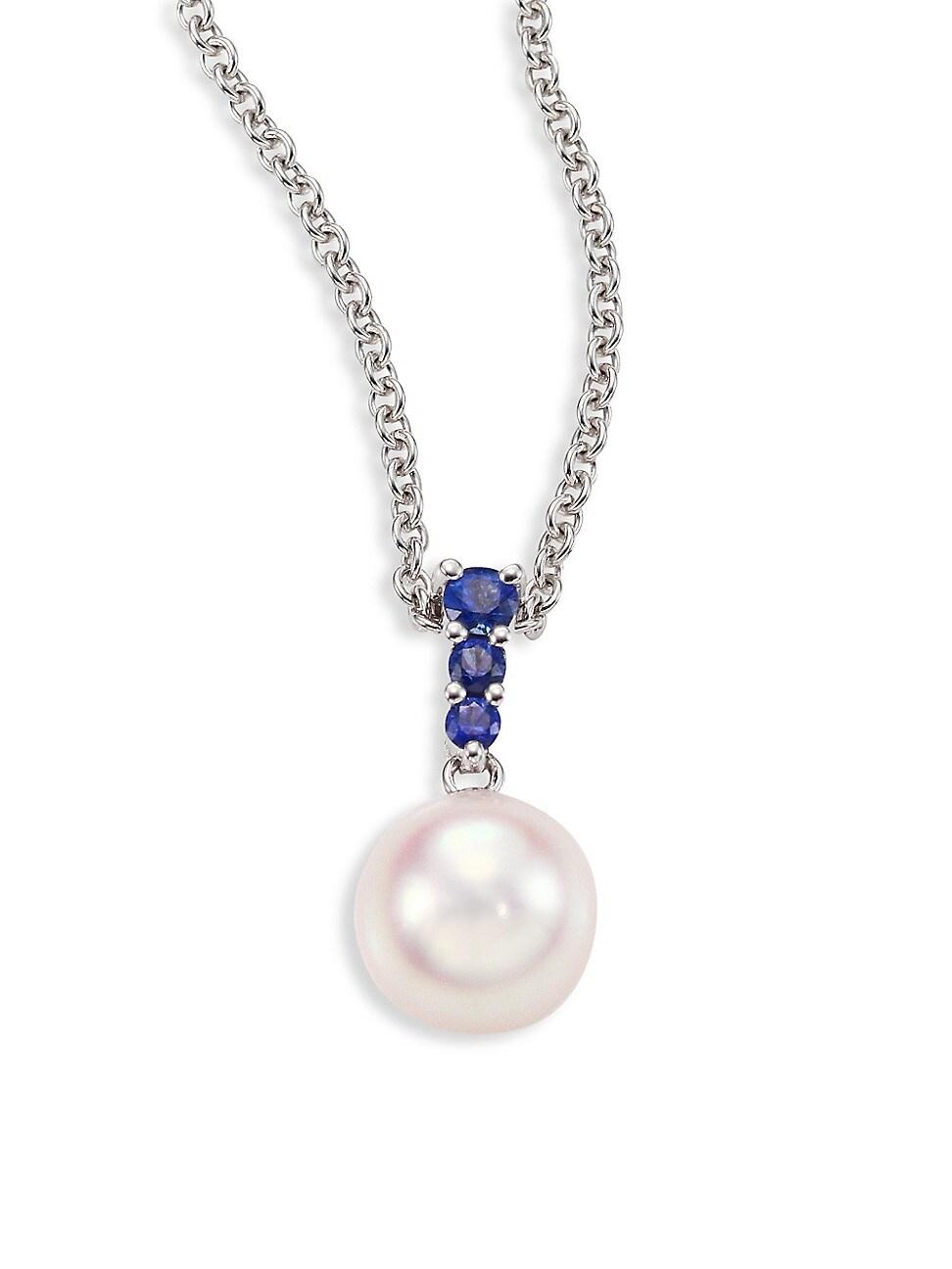 From the Morning Dew Collection. A lustrous Akoya pearl balances with perfect elegance beneath a series of rich blue sapphires, the design displayed as a pendant in a setting of 18k white gold. White round cultured Akoya pearl Sapphire Sterling silver Drop, about 1 Fixed bail Imported SIZE Chain length, 16 with a 2 extender Pearl width, about 9mm. Fine Jewelry - Pearl Jewelry > Mikimoto > Saks Fifth Avenue > Barneys. Mikimoto. Color: Pearl.