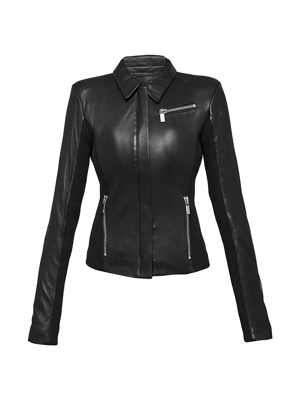 Designed to contour your silhouette, the Mrs. Smith Leather Jacket is crafted with Lamb Leather and Stretch Ribbed Panel accents. This jacket allures a bold and confident look. This black leather jacket is designed for a tailored fit chunky metal zippers, shoulder pads and contrast rib paneling on the sleeves and bodice to hug the body. Pair this style with a little black dress for an alluring look. This style runs very fitted. If you are in between sizes, we suggest sizing up for extra room if needed or ordering your normal size for a tailored fit. Runs fitted Fully lined Contrast rib knit panels on sleeves and bodice Center front zip closure Model is 59 and wearing a US size S Self: 100% Leather Rib: 98.5% Polyester, 1.5% Elastane Lining: 100% Polyester Dry Clean by Leather Professional only Imported. Lsd Rtw - Womens Rtw Lsd Mp > As By Df > Saks Fifth Avenue > Barneys. AS by DF. Color: Black. Size: XS.