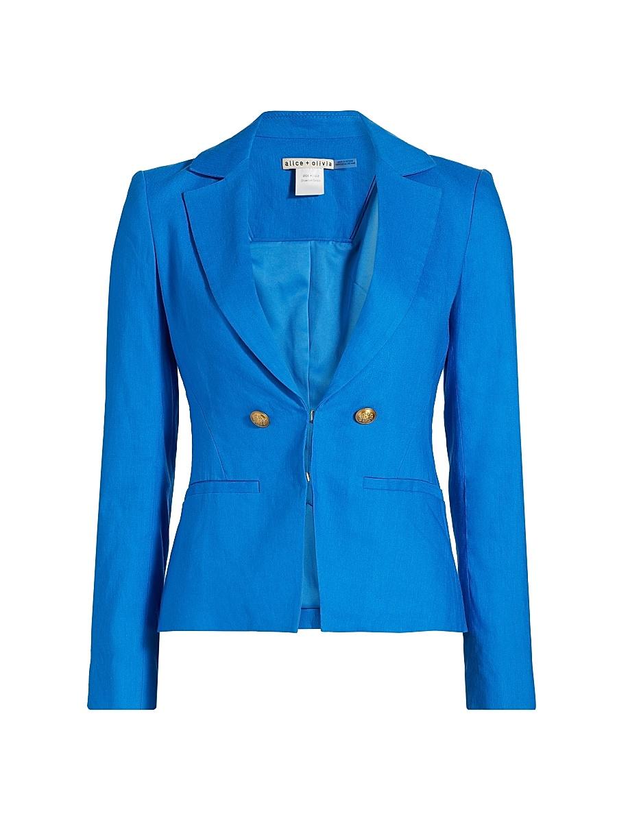Crafted of a linen blend, Alice + Olivias Mya blazer is tailored to a slim fit and styled with decorative metallic buttons on the front. Notch lapels Long sleeves, button cuffs Waist welt pockets Front hook-and-bar closure 56% linen/43% viscose/1% elastane Lining: 100% polyester Dry clean Imported SIZE & FIT About 24.5 from shoulder to hem Model measurements: 510 tall Model is wearing a US size 4 ABOUT THE BRAND Founder Stacey Bendet has been embracing bold color, eclectic prints and an overall passion for whimsy since launching Alice + Olivia in 2002. From party-ready dresses to statement tops and everything in between, shes created a playful and overtly feminine aesthetic thats uniquely her own. Contemporary Sportswear - Alice + Olivia > Alice + Olivia > Saks Fifth Avenue > Barneys. Alice + Olivia. Color: True Blue. Size: 4.
