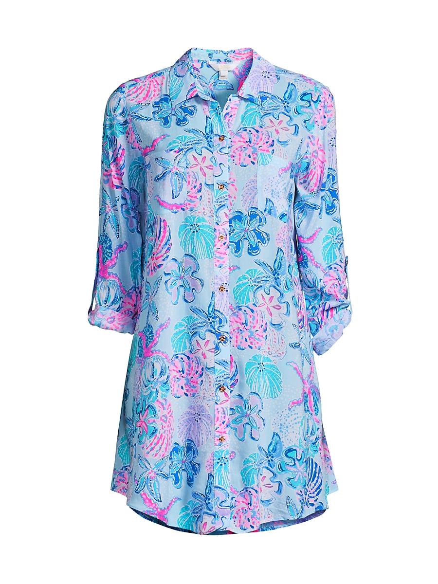 Showcasing a bold sea-life print, the Natalie shirtdress coverup from Lilly Pulitzer is styled with classic shirt detailing like a spread collar, chest patch pocket, and button-front closure. Spread collar Rolled three-quarter-length sleeves Chest patch pocket Button-front closure 100% rayon Hand wash Imported SIZE & FIT Model measurements: 510 tall Model is wearing a US size Small Please note: Due to the vibrancy of our custom colors, this products color may vary slightly when seen in person. Outerwear And Swimwear - Contemporary Swim > Lilly Pulitzer > Saks Fifth Avenue > Barneys. Lilly Pulitzer. Color: Multi Bahamas Beachcomber. Size: XL.