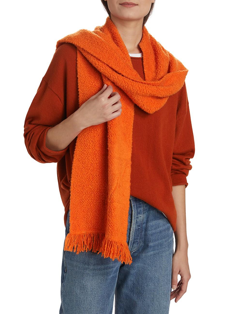 From the New Beginnings Collection. Crafted of a wool blend, Jane Carrs The Teddy Scarf is crafted of plush fabric and flaunts fuzzy fringed hems. Fringed hems 77% wool/15% nylon/8% cashmere Dry clean Imported SIZE About 10W x 72L. Soft Accessories - Scarves > Jane Carr > Saks Fifth Avenue > Barneys. Jane Carr. Color: Pumpkin.