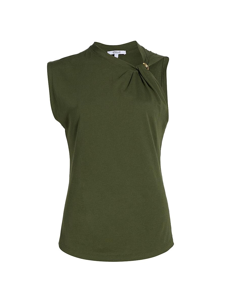 Crafted of cotton jersey, Derek Lam 10 Crosbys Nia T-shirt is styled with an asymmetric neckline featuring a twist detail embellished with goldtone hardware. Asymmetric neck Sleeveless Pulls over 100% cotton Machine wash Imported SIZE & FIT About 26 from shoulder to hem Model measurements: 510 tall Model is wearing a US size Small ABOUT THE BRAND Eight years after founding his eponymous brand, Derek Lam launched Derek Lam 10 Crosby in 2011, named after the address of his New York City office