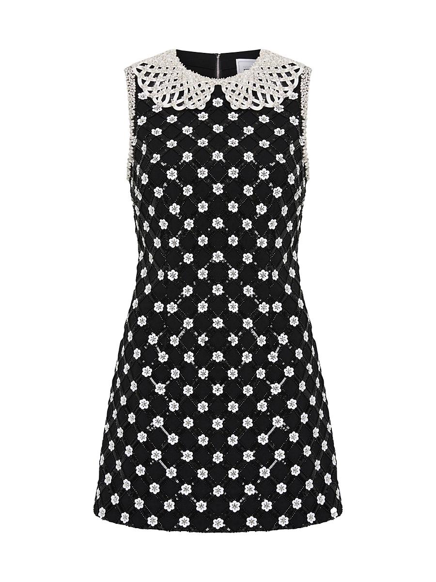 From the Nicky Hilton x Rebecca Vallance Collaboration. Woven with a decorative collar with faux pearl beading, Rebecca Vallances Alivia minidress showcases a sleeveless shift silhouette with faux pearls and sequin details. Peter pan collar Sleeveless Back zip closure 98% polyester/2% elastane Lining: 97% polyester/3% elastane Dry clean Imported SIZE & FIT About 33 from shoulder to hem Model measurements: 510 tall Model is wearing a US size 4. Dress Collections - Contemporary Evening > Rebecca Vallance > Saks Fifth Avenue > Barneys. Rebecca Vallance. Color: Black. Size: 2.