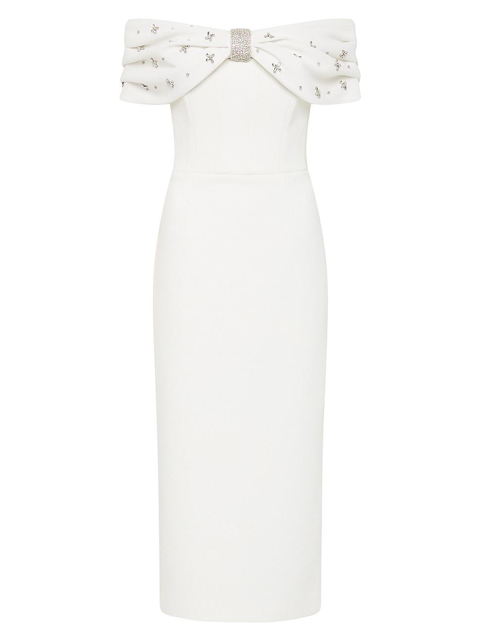 From the Nicky Hilton x Rebecca Vallance Collaboration. Rebecca Vallances Gianna off-the-shoulder cocktail midi-dress showcases a fitted bodice with boning, a pencil skirt with a back slit, and diamant details at the neckline. Off-the-shoulder neck Sleeveless Back slit Back zip closure 98% polyester/2% elastane Dry clean Imported SIZE & FIT About 42 from topline to hem Model measurements: 510 tall Model is wearing a US size 4. Dress Collections - Contemporary Evening > Rebecca Vallance > Saks Fifth Avenue > Barneys. Rebecca Vallance. Color: Ivory. Size: 8.
