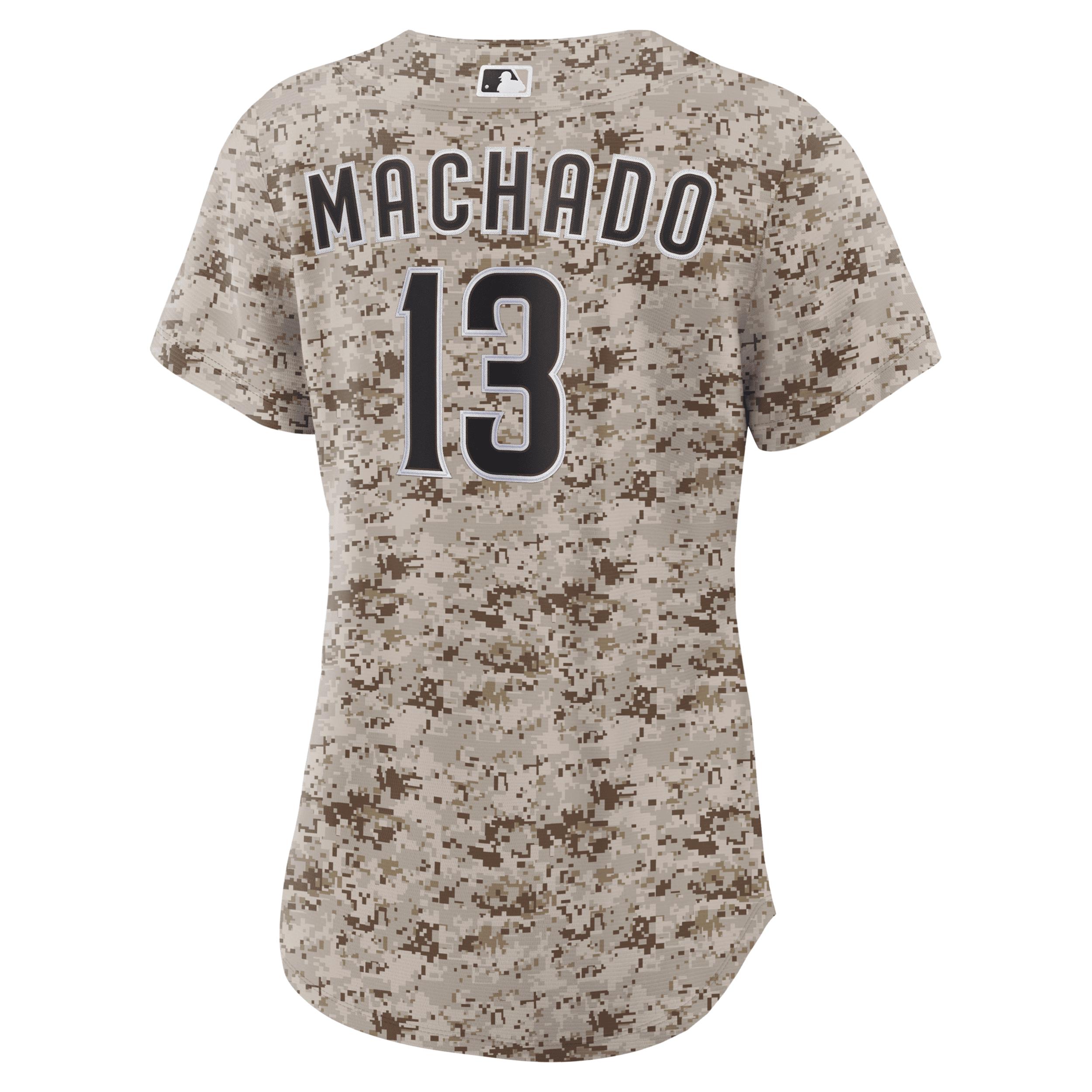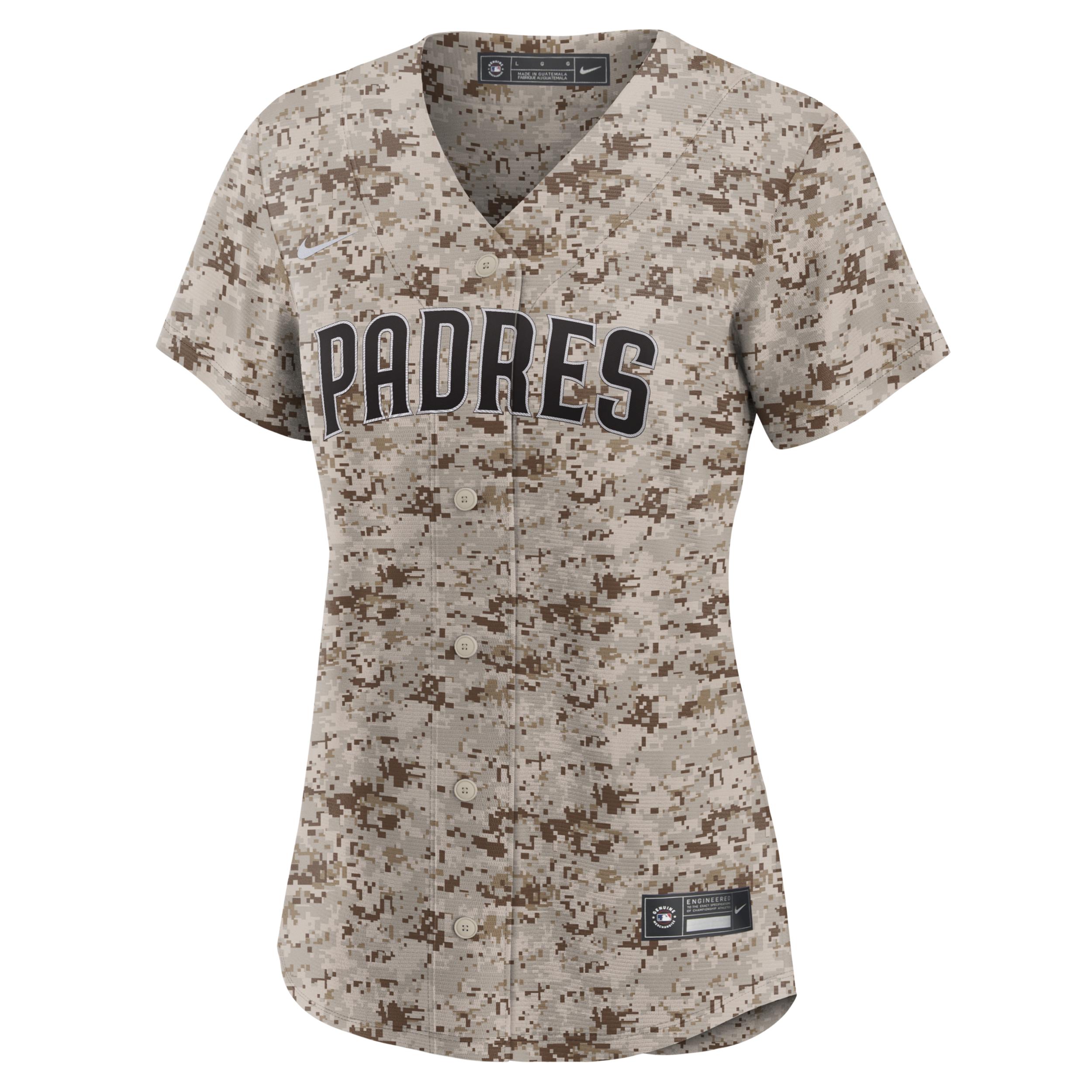 The San Diego Padres USMC Jersey helps deliver a comfortable fit on game day with its polyester fabric. It features a camo design that is synonymous with San Diego to help you proudly support your team and country. Product Details: 100% polyester. Machine wash. Imported. Style: T77303W9PY7; Color: Desert Camo; Size: S; Gender: Female; Age Group: Adult | Manny Machado San Diego Padres USMC Women's Nike MLB Replica Jersey in Brown, Size: Small | T77303W9PY7-M13