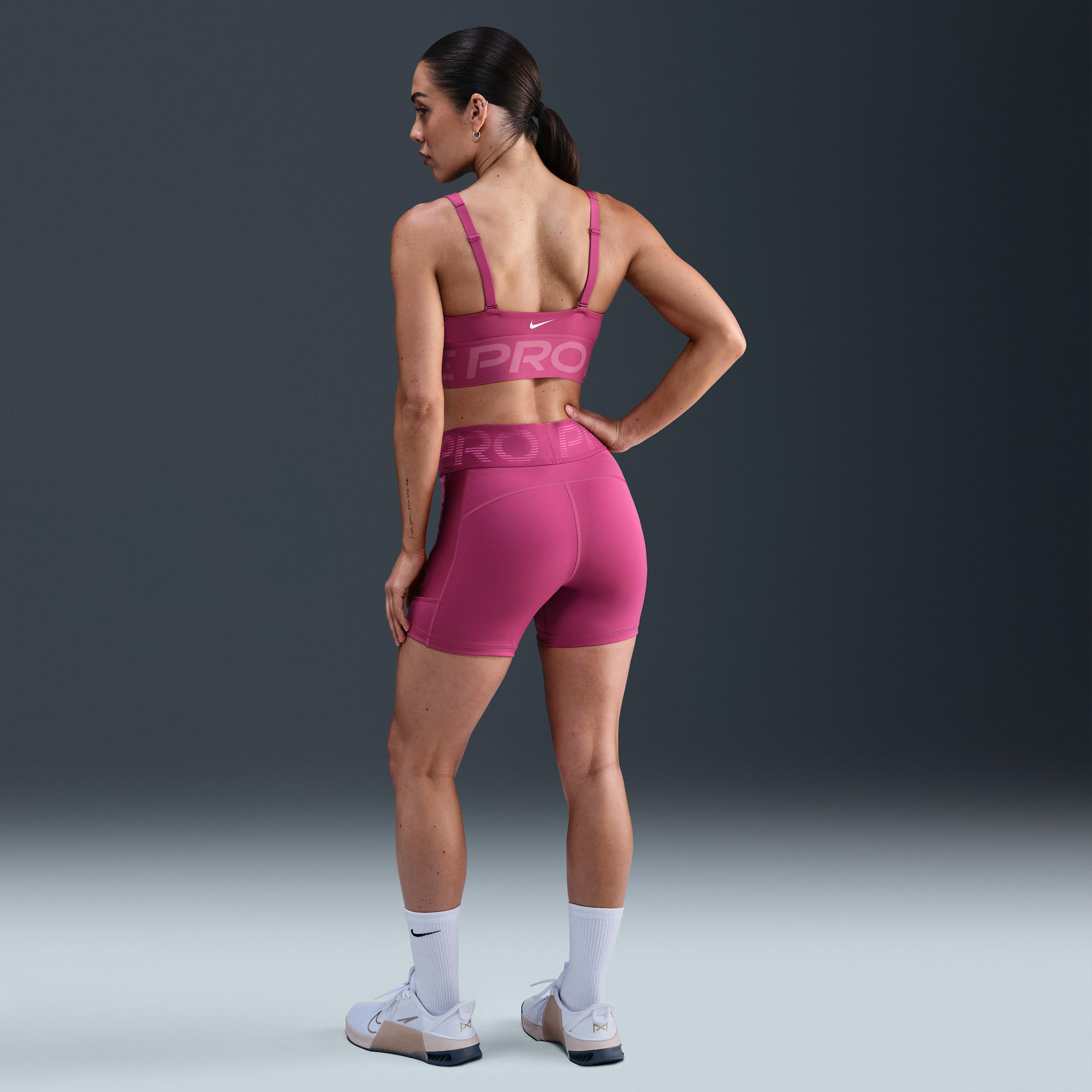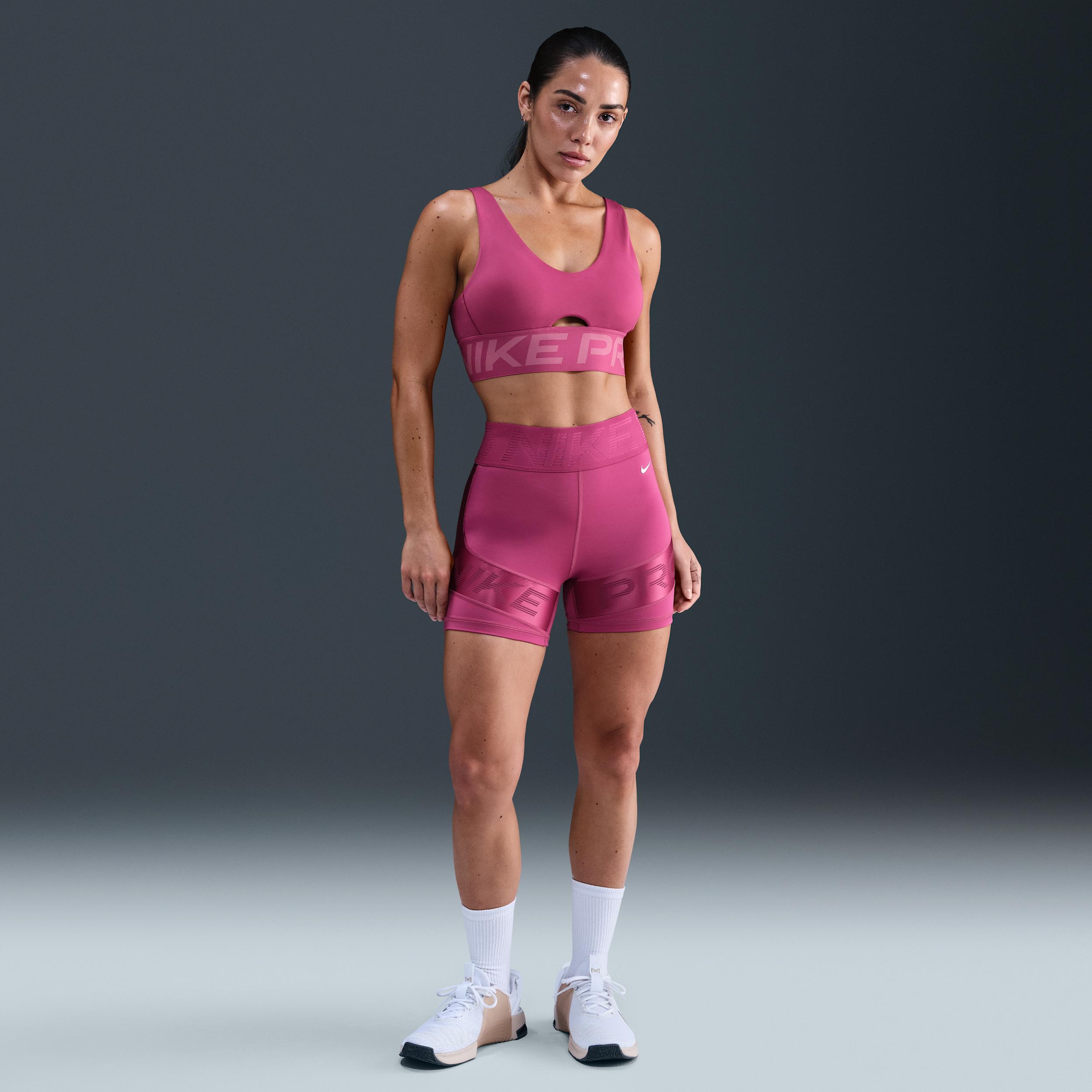 Show up and show off in this bold plunging sports bra. Minimized coverage still delivers a snug hold that helps keep everything in place, so you can keep pushing yourself. Plus, convertible straps and removable pads give you the freedom to style it your way. Like a Pro:Unapologetic, confident style goes with anything. From leggings to tops to more, Nike Pro is ready to round out your wardrobe with pieces that help you stand out. Stay Cool:Nike Dri-FIT technology moves sweat away from your skin for quicker evaporation, helping you stay dry and comfortable. A cutout at the center front and a minimal silhouette offer increased airflow. [] Product Details:Jacquard elastic chest band. Body:72% polyester/28% spandex. Bottom hem:70% polyester/18% spandex/12% nylon. Straps:79% nylon/21% spandex. Lining:88% polyester/12% spandex. Pad top fabric:100% polyester. Pad:100% polyurethane. Pad back fabric:100% polyester. Machine wash. Imported. Style: HF7324; Color: Sweet Beet/Desert Berry/White; Size: XL; Gender: Female; Age Group: Adult | Nike Pro Indy Plunge Women's Medium-Support Padded Sports Bra in Purple, Size: XL | HF7324-634