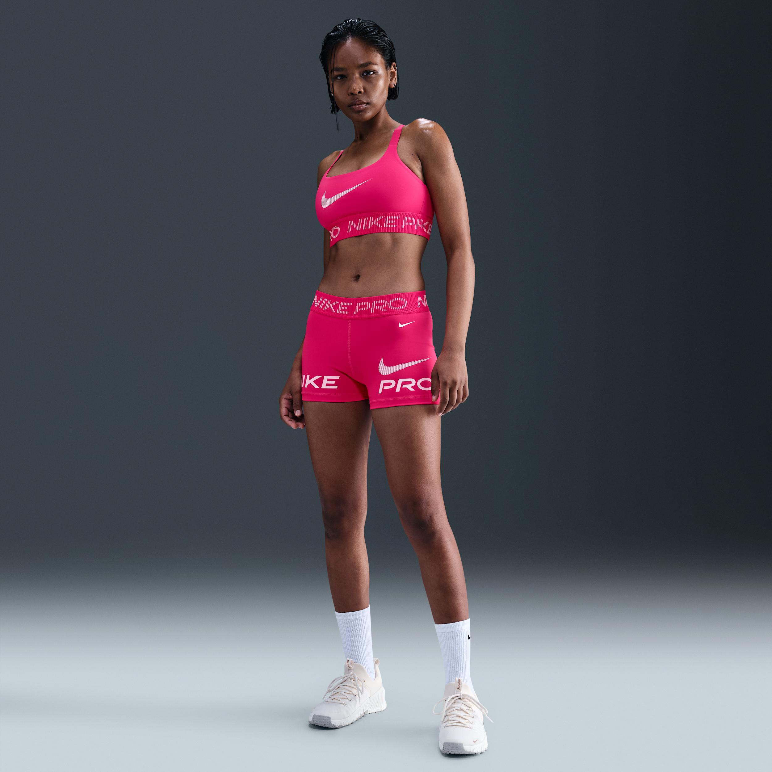 Sweat it out in this Nike Pro sports bra. Lightweight and stretchy, the smooth fabric dries quickly to help you stay comfortable when your workout heats up. A gentle hold and non-padded design gives you plenty of freedom to do you. Like a Pro:Unapologetic, confident style goes with anything. From leggings to tops to more, Nike Pro rounds out your wardrobe with pieces that help you stand out. Work Hard, Stay Dry:Nike Dri-FIT technology moves sweat away from your skin for quicker evaporation, helping you stay dry and comfortable. Soft and Secure:A soft jacquard elastic chest band sits snugly against your skin without pinching or binding. [] Product Details:Printed Swoosh logos on front and back. Body/Lining:83% polyester/17% spandex. Bottom hem:90% polyester/10% spandex. Straps:73% nylon/27% spandex. Machine wash. Imported. Style: IF3973; Color: Rush Pink/Pink Foam/White; Size: S; Gender: Female; Age Group: Adult | Nike Pro Women's Light-Support Non-Padded Sports Bra in Pink, Size: Small | IF3973-666
