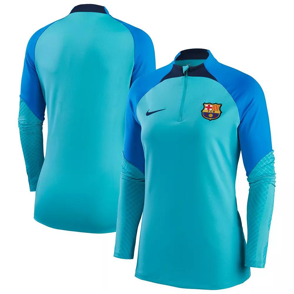 ELEVATE YOUR TRAINING. The FC Barcelona Strike Top has design details specifically tailored for soccer�s rising stars. A slim, streamlined fit ensures that nothing comes between you and the ball, and sweat-wicking technology helps keep you cool and composed while fine-tuning your skills. Stay Dry: Nike Dri-FIT technology moves sweat away from your skin for quicker evaporation, helping you stay dry and comfortable,Stay-Put Fit: Invisible Thumb Loops help hold the sleeves in place as you move then seamlessly disappear when not in use. Extended Coverage: Longer hem in the back helps keep you covered. Product Details: Slim fit for a tailored feel. Body: 90-91% polyester/9-10% spandex. Panels: 94-95% polyester/5-6% spandex. Material percentages may vary. Check label for actual content. Machine wash. Imported. Style: DJ8640; Color: Oracle Aqua/Signal Blue/Obsidian/Obsidian; Size: M; Gender: Female; Age Group: Adult | FC Barcelona Strike Women's Nike Dri-FIT Soccer Drill Top in Blue, Size: Medium | DJ8640-359